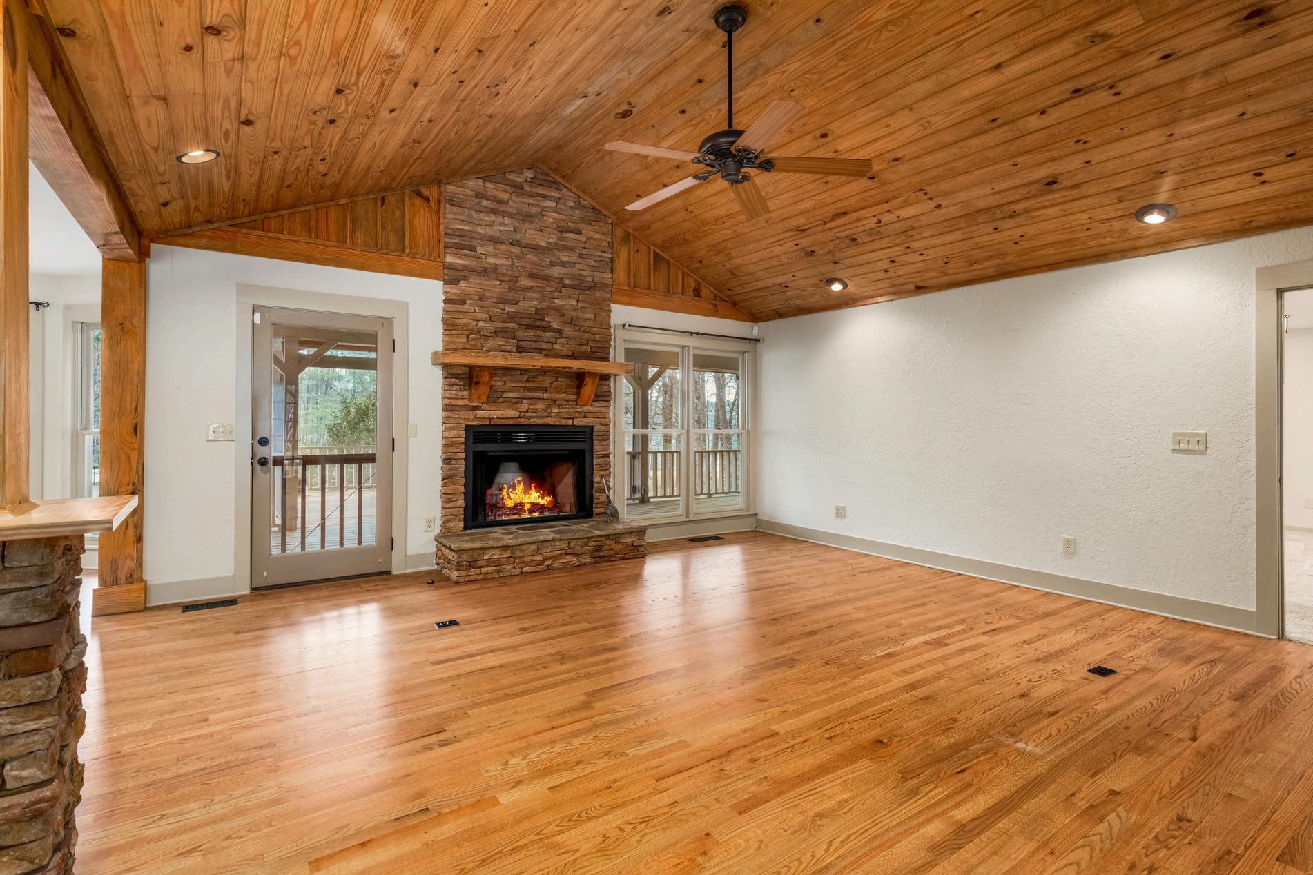 Great room with wood-lined ceiling and striking stone fireplace
