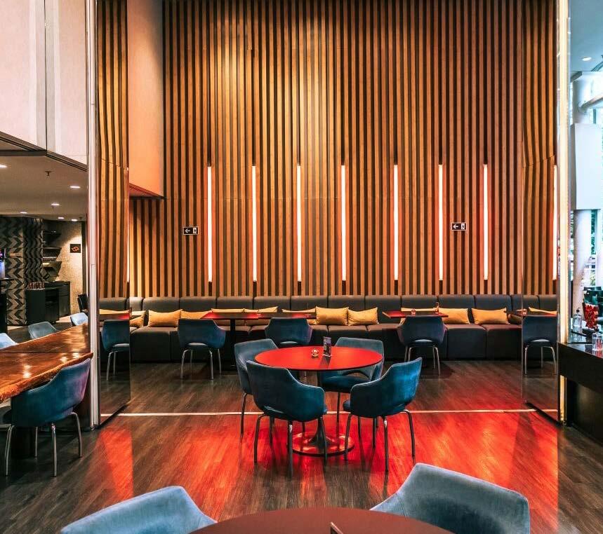 Beneath the glistening Dubai skyline on the 20th floor of the Grand Millennium Hotel Business Bay, Bella Restaurant & Lounge invites patrons to a luxurious dining experience. As the sun sets over the shimmering waters, guests ascend to the rooftop, where Bella unfolds in two distinctive spaces. The loft-like lounge boasts a private dining table presiding over a retro-lit amber bar, dining alcoves, and a pulsating DJ booth. Transition seamlessly to the effortlessly elegant dining room and bar, offering panoramic views of the iconic Burj Khalifa and the hypnotic Dubai skyline.