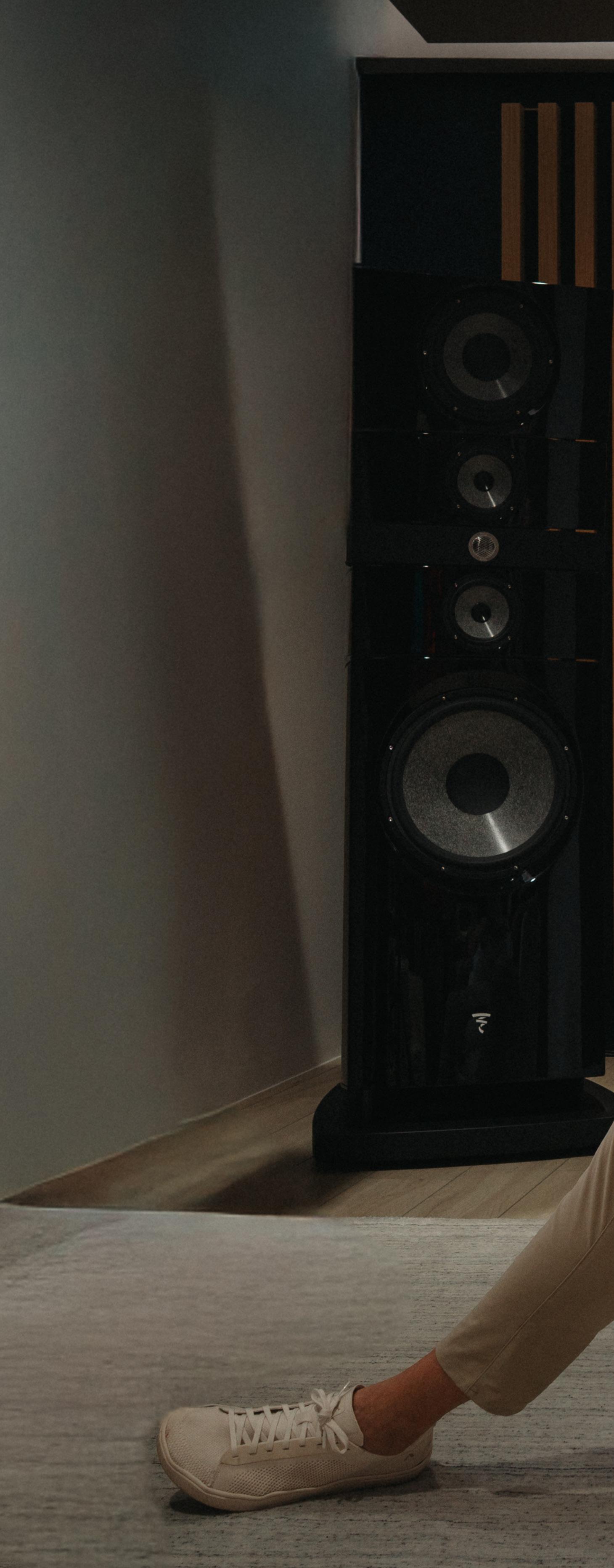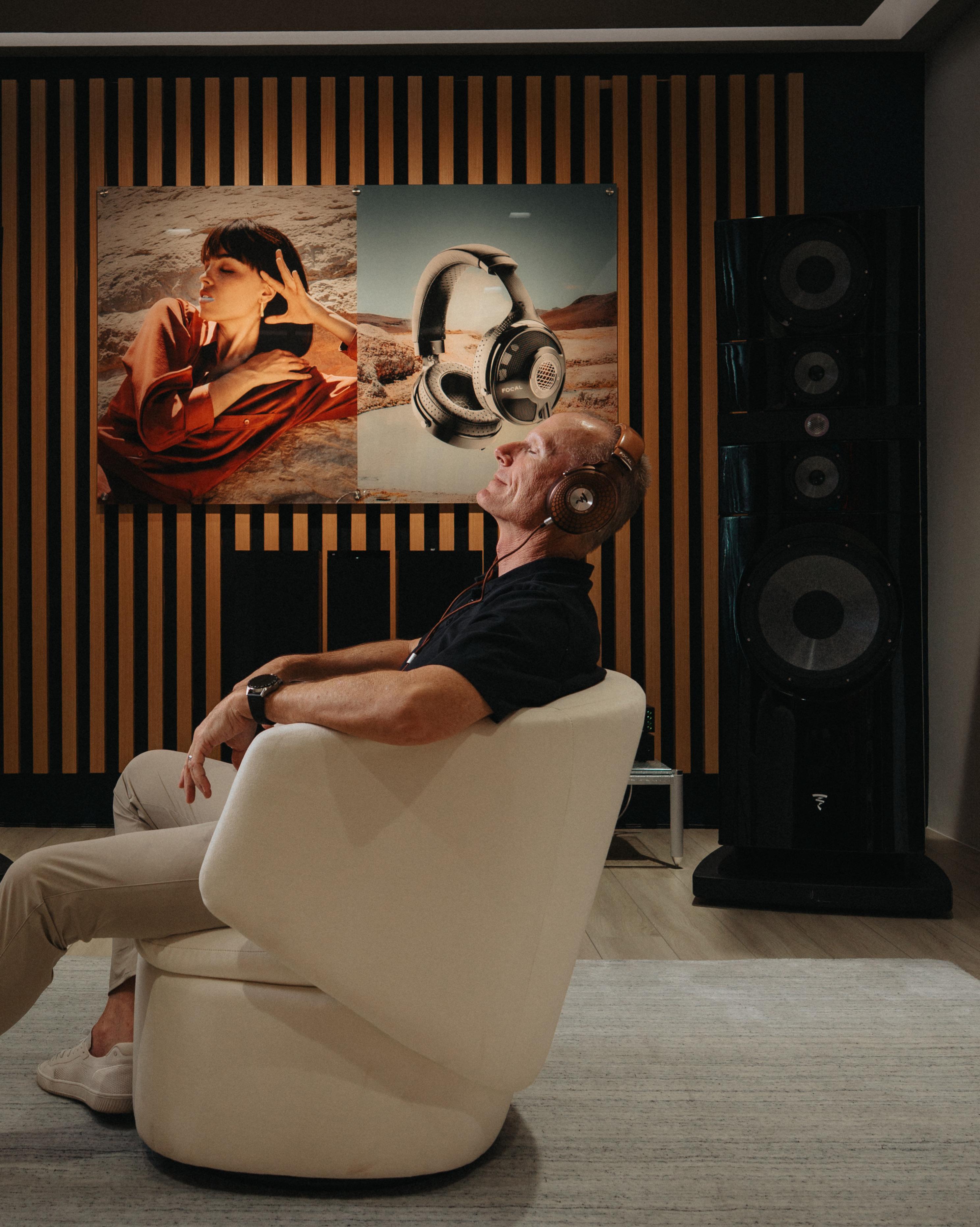 Chris Matthews in Acoustic Design Group's showroom listening room. These speakers create a spatial soundstage that images the exact positioning of each musician, turning recorded music into a live performance you can visualize with your eyes closed.