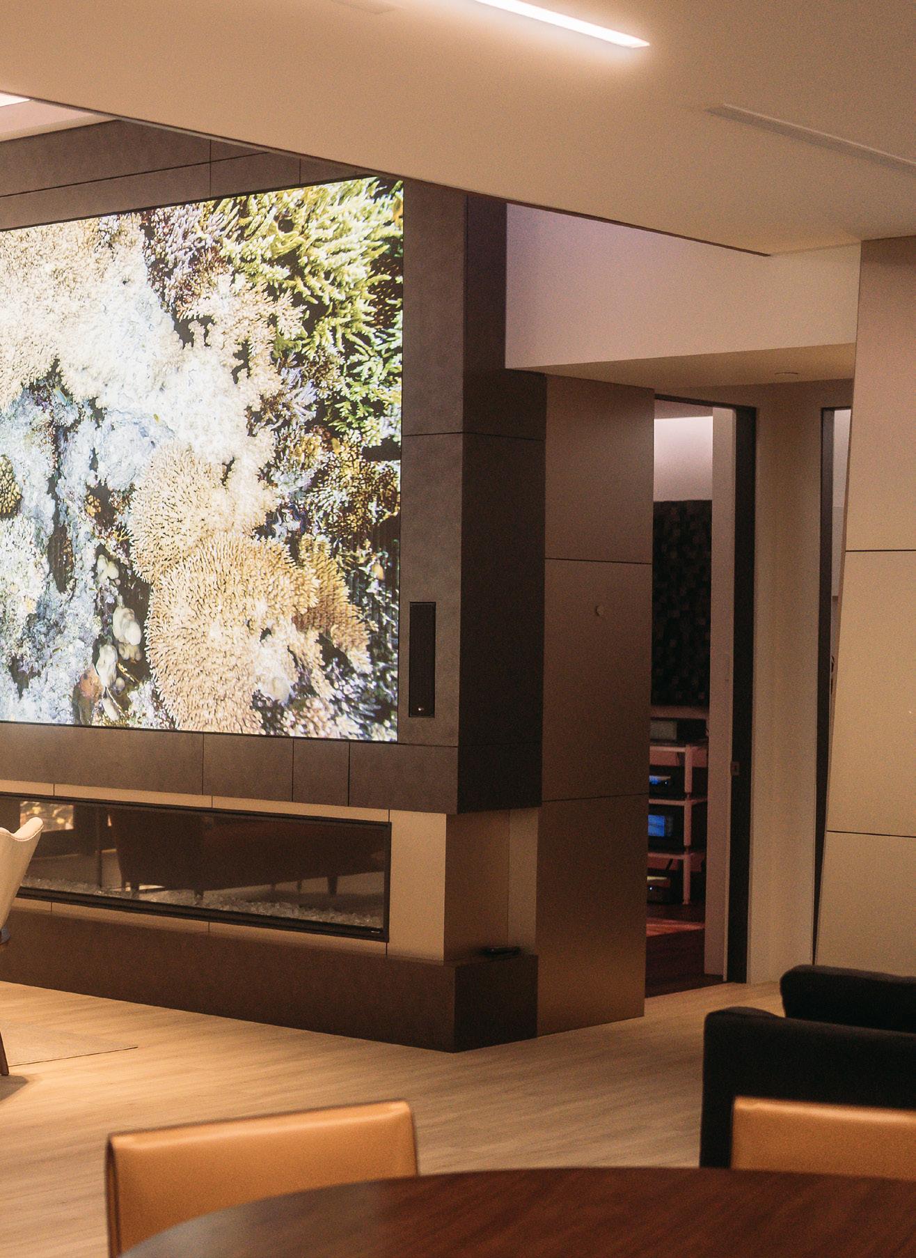 That same restraint carries through the rest of the home. Audio systems now disappear entirely, concealed within small-aperture speakers that align visually with recessed lighting, preserving ceiling planes rather than puncturing them. Screens have grown larger, yet paradoxically less dominant. Video walls that rival private cinemas retract into ceilings or vanish behind architectural panels, present when desired, absent when not.