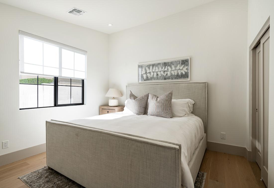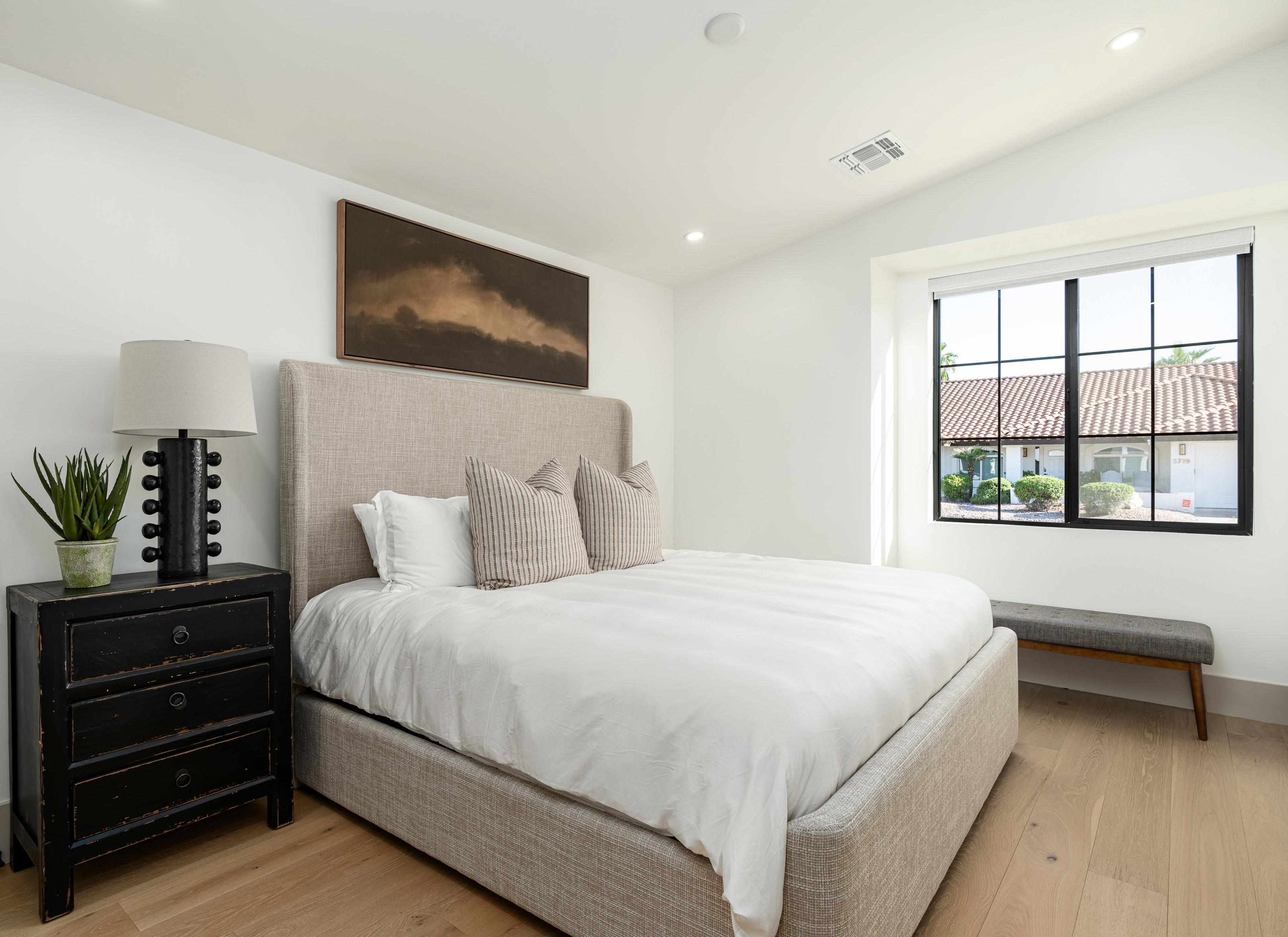 The primary suite at The Marilyn is a sanctuary of style and tranquility. A spacious bedroom with vaulted ceilings and sliding glass doors blurs the line between indoors and out, filling the room with natural light.