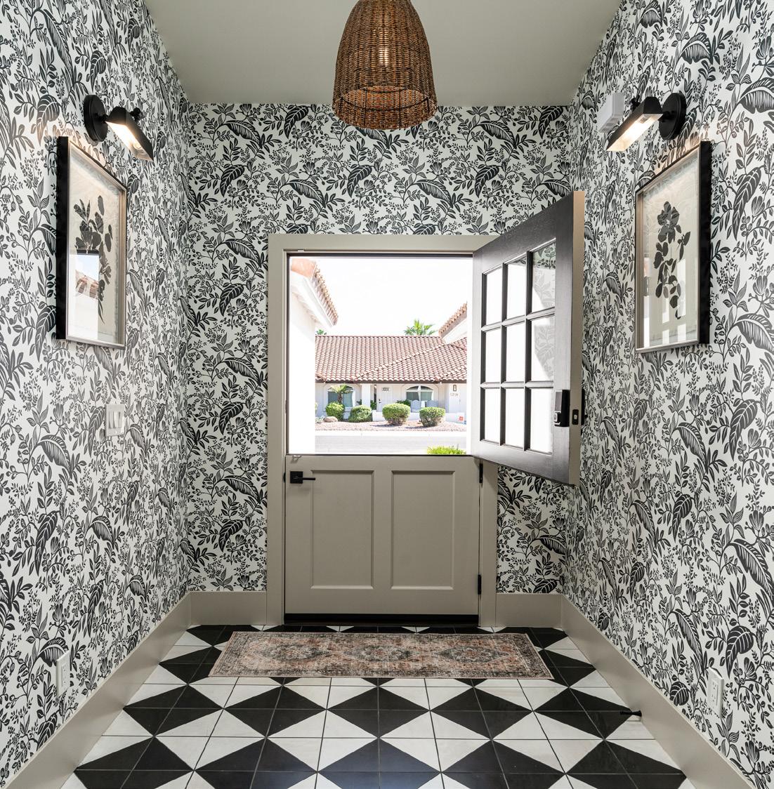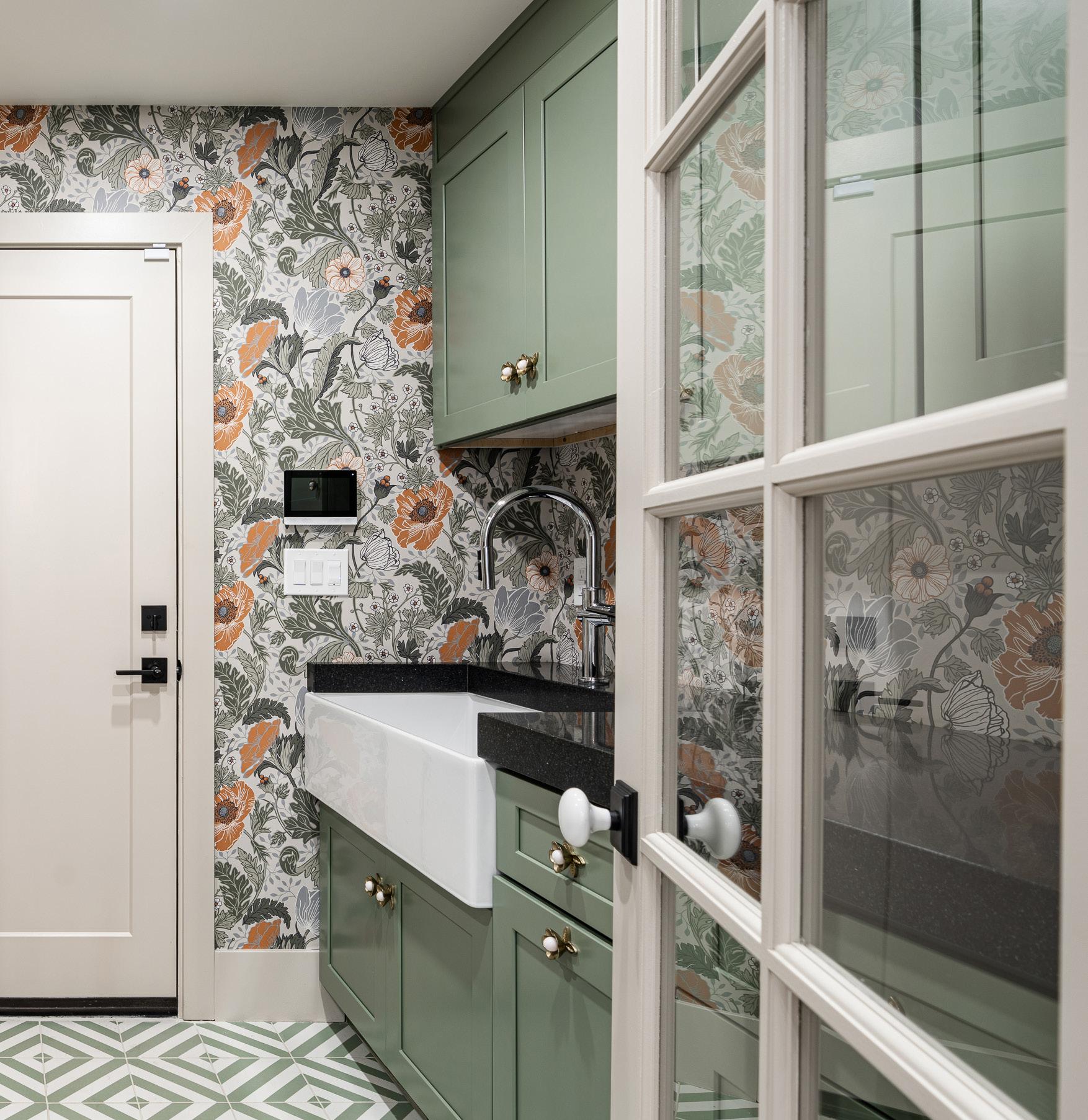 Even the laundry room at The Marilyn feels like a design moment. Wrapped in bold floral wallpaper and paired with patterned tile underfoot, the space transforms a daily task into an inspiring ritual. Custom cabinetry in a soft sage hue offers ample storage, while a farmhouse sink adds both charm and function. With a washer and dryer tucked neatly in place, this room blends utility with artistry—proof that at The Marilyn, every corner is as thoughtfully curated as the next.