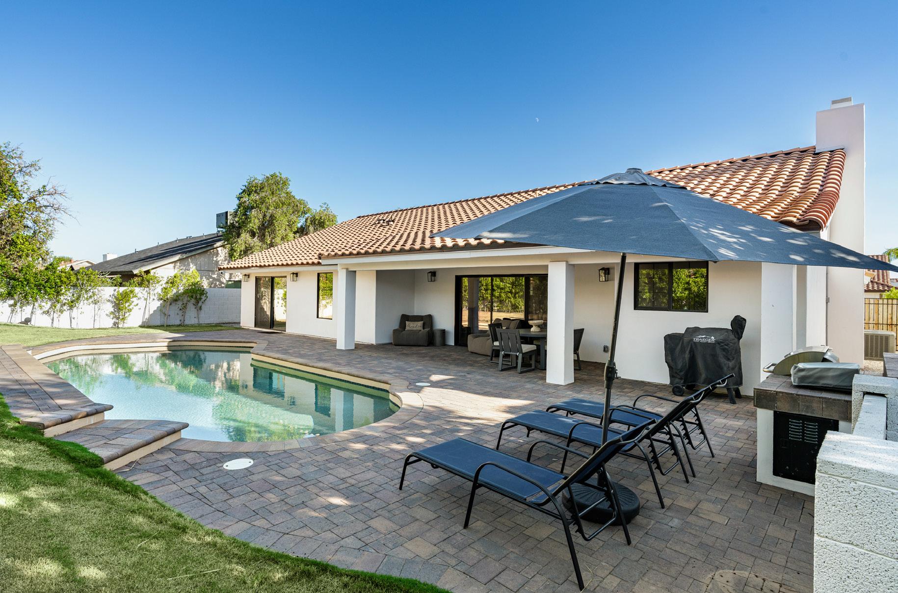 Designed for both relaxation and entertainment, the backyard at The Marilyn is a private oasis under the Arizona sun. A sparkling heated pool takes center stage, framed by lush greenery and plenty of space to lounge or play. The covered patio offers shade and comfort, complete with ceiling fans and room for alfresco dining. An outdoor grill station sets the stage for evenings with friends, while the overall layout balances beauty and function, creating a retreat you’ll never want to leave.