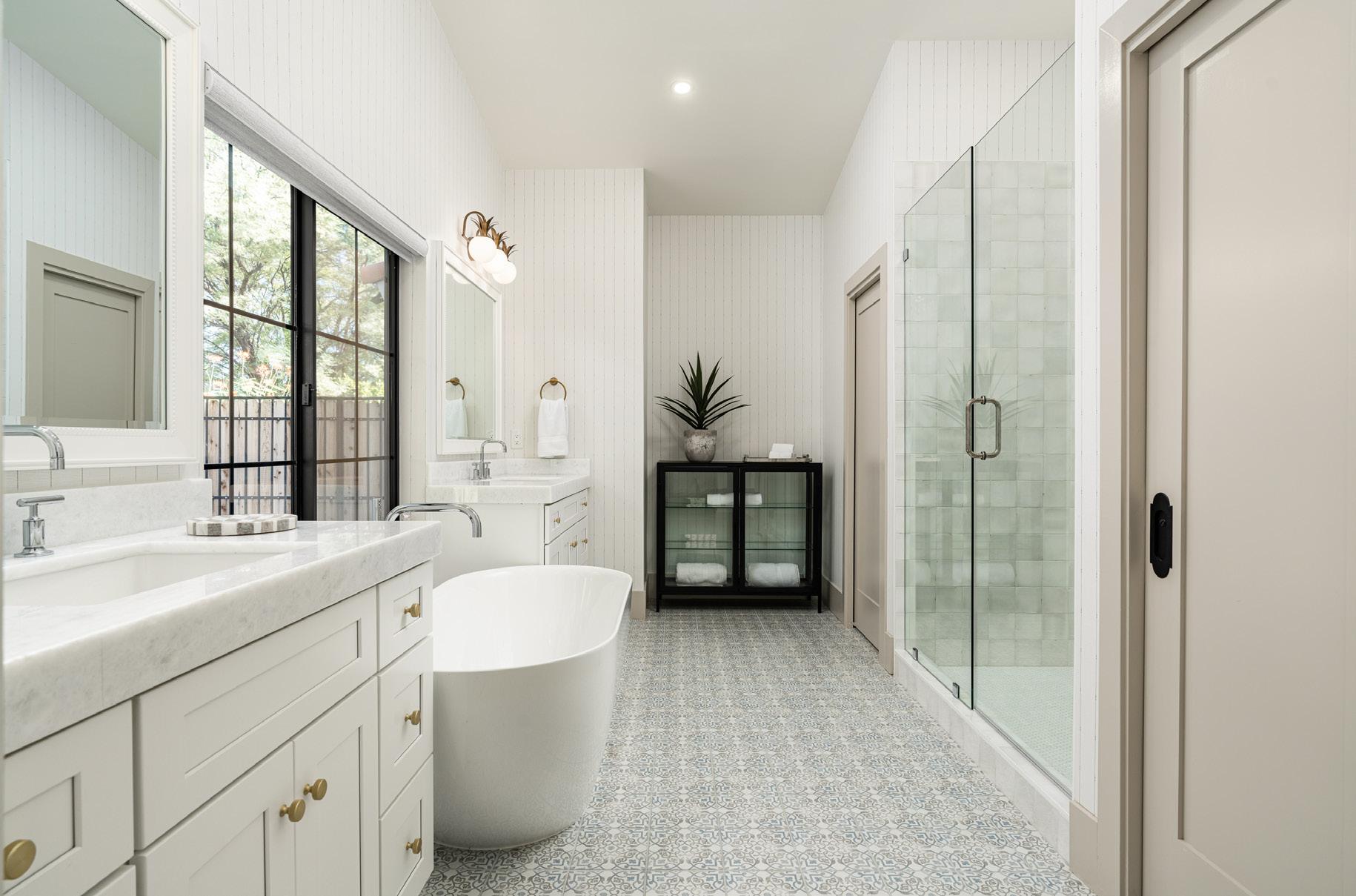 The en-suite bathroom offers spa-like indulgence with dual vanities, a soaking tub, and a walk-in shower framed by timeless tile work. Every element, from the elegant chandelier to the calming finishes, creates a retreat designed for rest, renewal, and everyday luxury.