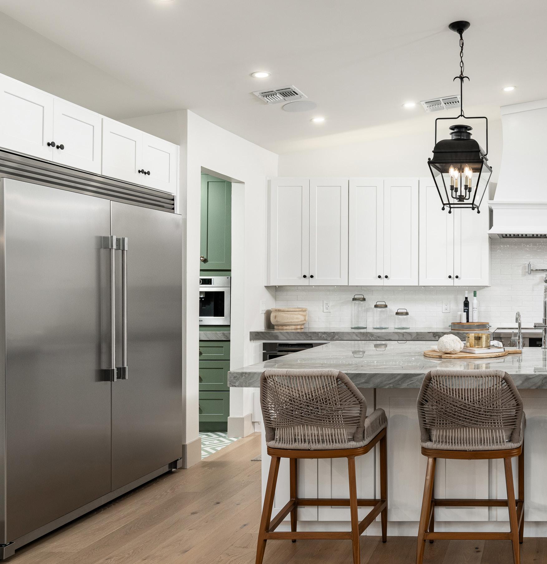 The kitchen at The Marilyn is both a culinary stage and a design statement. Quartzite countertops and custom cabinetry set a refined backdrop, while professional-grade appliances bring effortless function. At the center, an oversized island invites conversation, connection, and everyday living. Just beyond, a jewel-box coffee nook and butler’s pantry wrapped in bold floral wallpaper steals the show, an unforgettable design detail that ties the home’s personality together and makes every morning ritual feel just a little more glamorous.