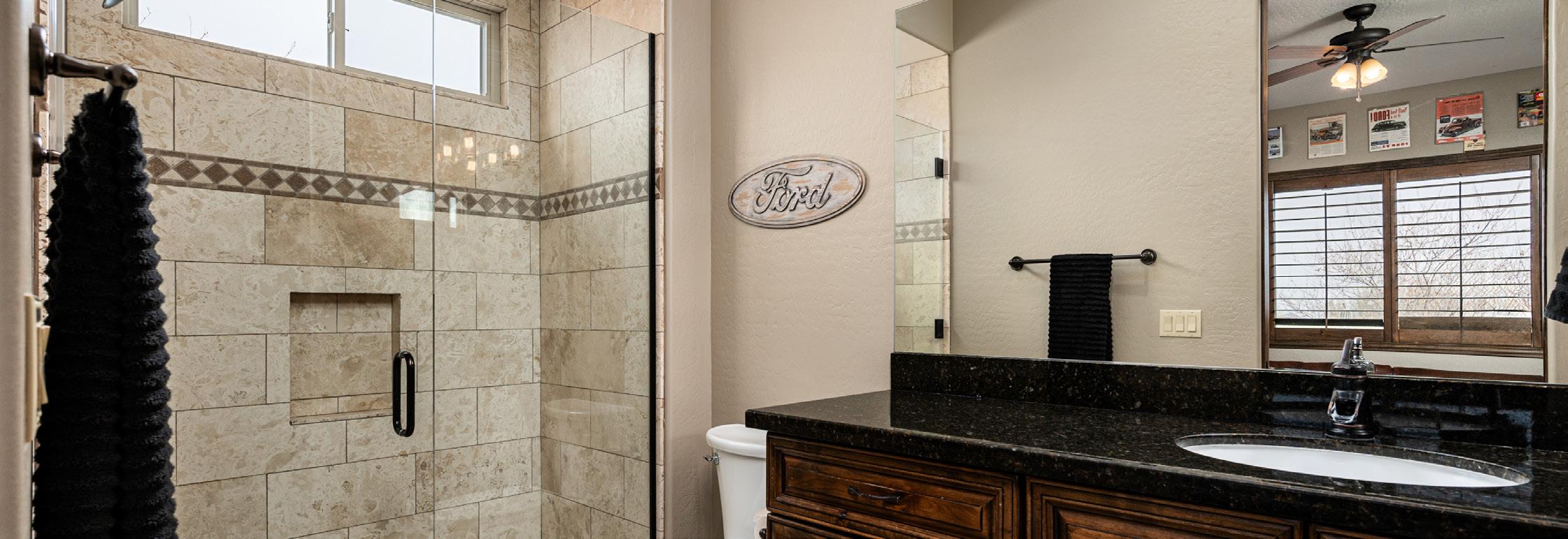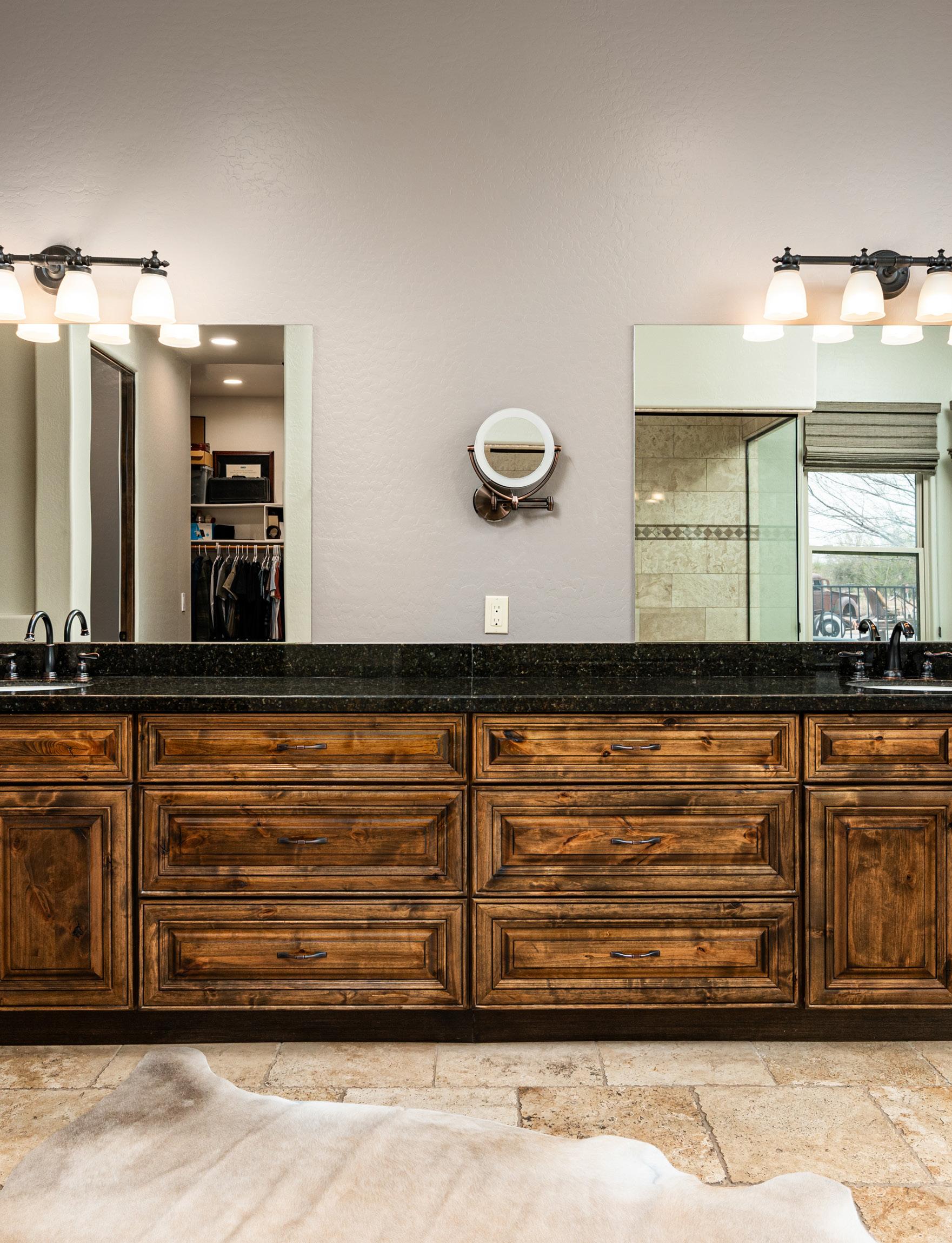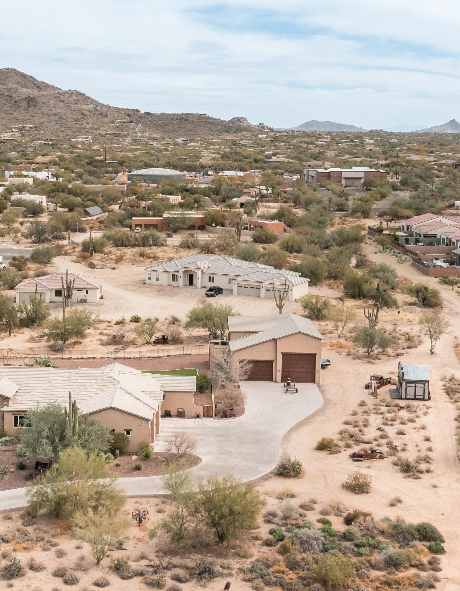 Inside, the main residence balances rustic elegance with warmth: rich wood beams, a statement stone fireplace, and custom cabinetry create a refined Western aesthetic, while large picture windows frame Pinnacle Peak and the desert beyond.