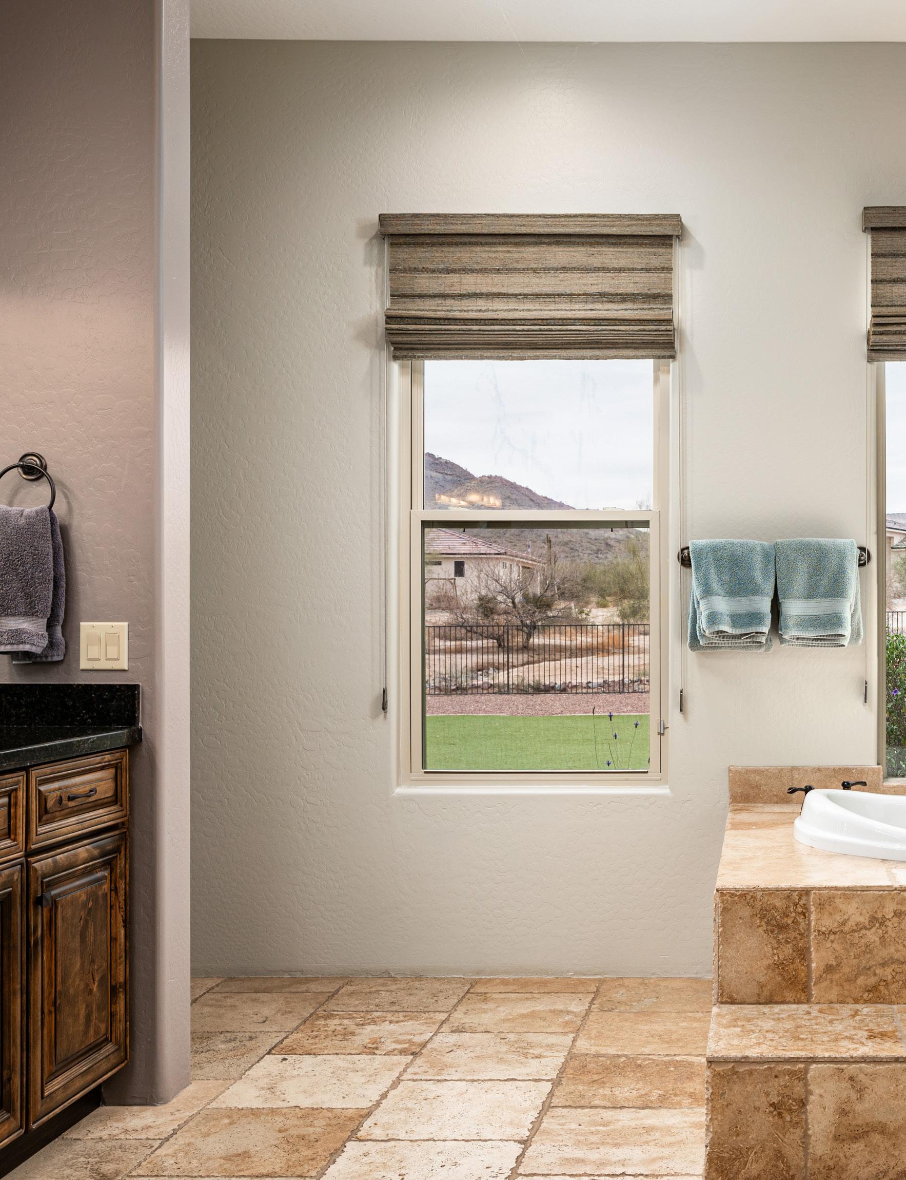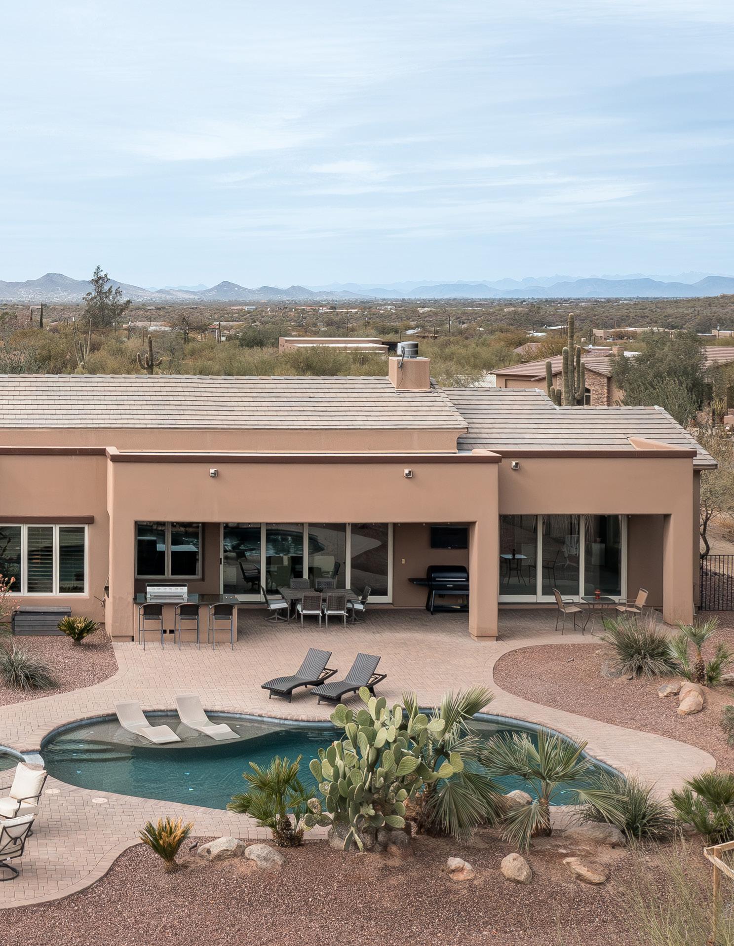 The backyard retreat features a pebble-finish pool with baja shelf, spa, and fire pit lounge—all designed for savoring Arizona sunsets under starlit skies.