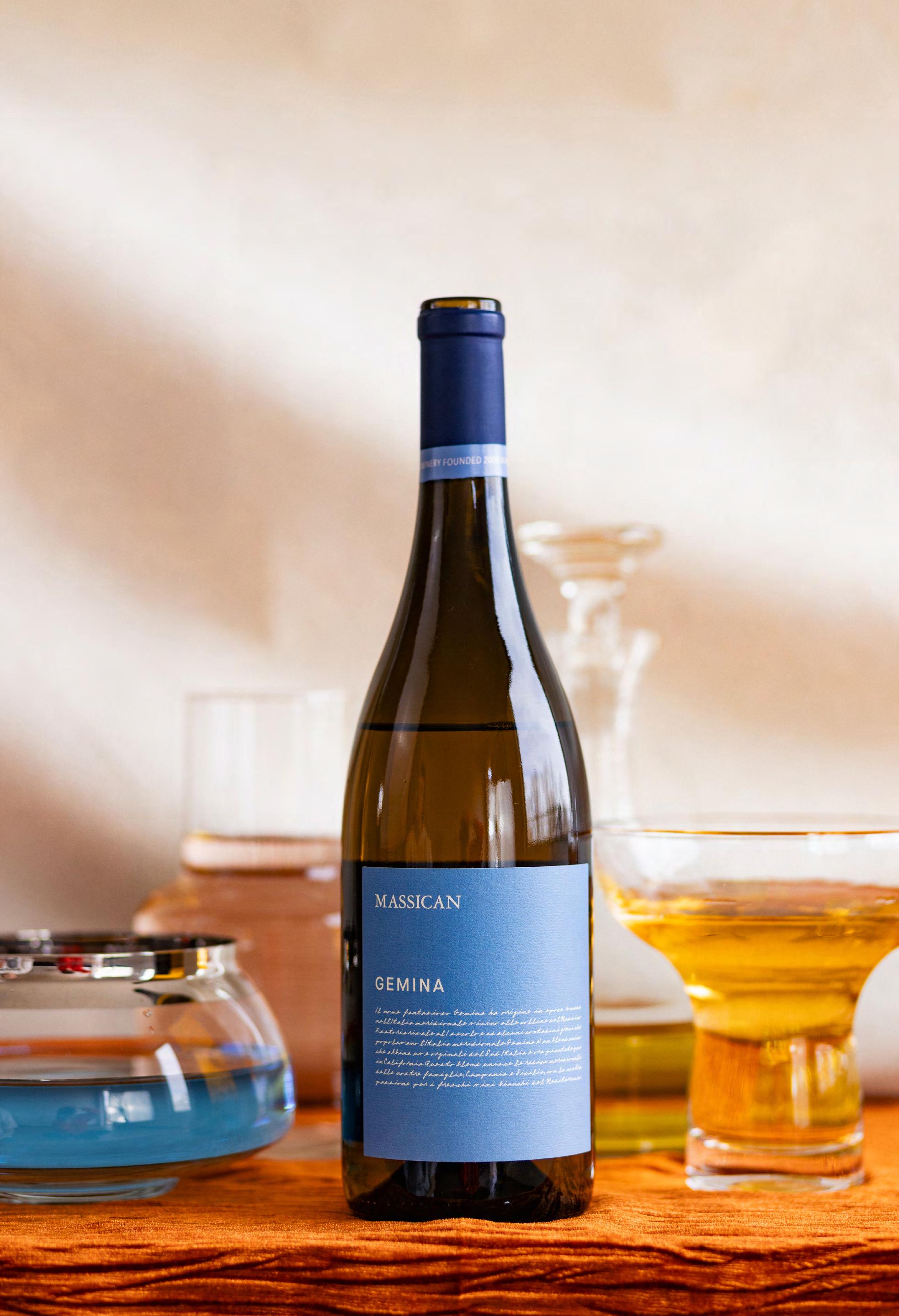 GEMINA, Massican’s “Southern Italian” blend of greco and falanghina - grapes typical in the Massican hills of Campania - is more vertical and intense, a briny, citrusy foil for oysters, olives, or even just a hot day.
