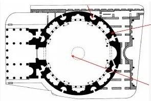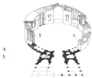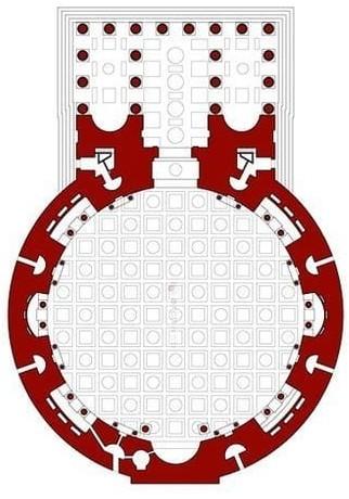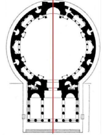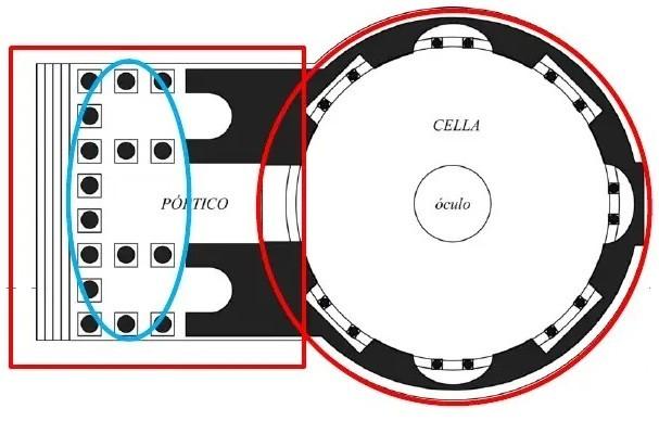 Ingreso por las naves laterales de pronaus seguido del porticoymasadelante el gramespaciode planta circular llamado cella