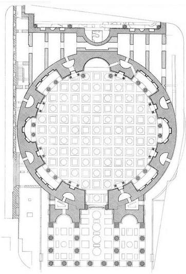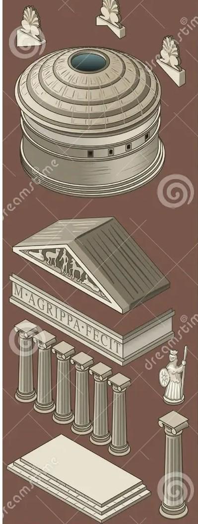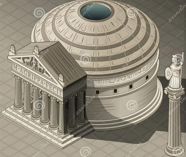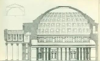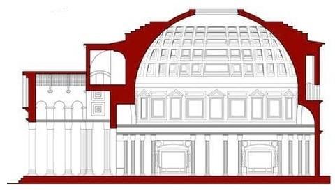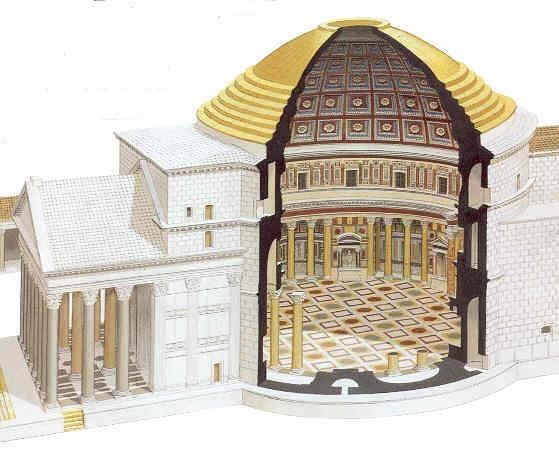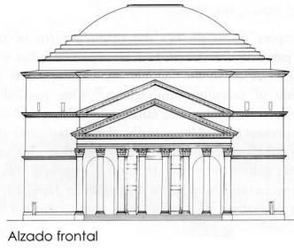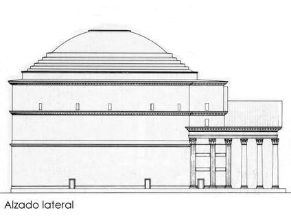 Formado por un cubo, cilindro y una esfera que vendría ser la cúpula del Panteón, teniendo como ejes horizontales y axil para su orden compositivo.