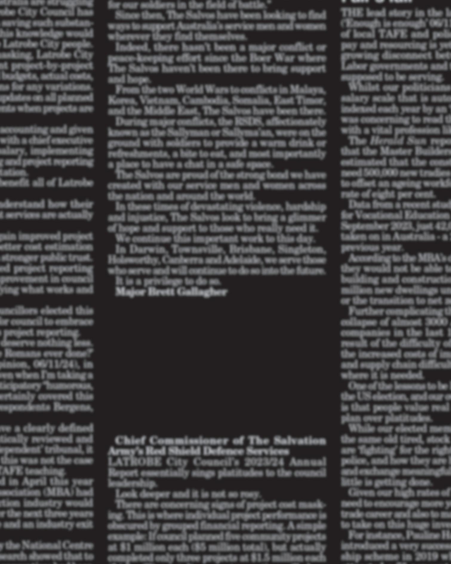 These amounts, allocated first, came out of the forecast surplus 2025/26, and totalled $123,000 of the $586,000 estimated for the surplus. This left the updated surplus at $463,000, half of which Cr Pugsley proposed, via an alternatemotion,togo to upliftingthe face of the towns, big and small, across the municipality overthe Christmas period. This was seconded by Boola Boola Ward's Cr David Barnes, who then rushed to speak too early -only to be halted by mayor Sharon Gibson for due procedure,allowing Yallourn Ward Councillor StephMorgan to form opposition.