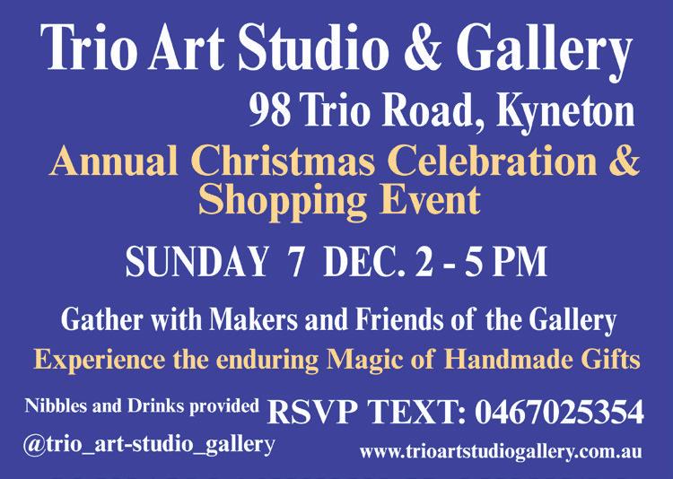 Cascade Art Christmas Gathering, 2pm, Cascade Art Gallery, Maldon Join award winningartistLiz Sullivan share her thoughts andreflections on what it means to be an artist. Free event. Lucky door prize winner!
