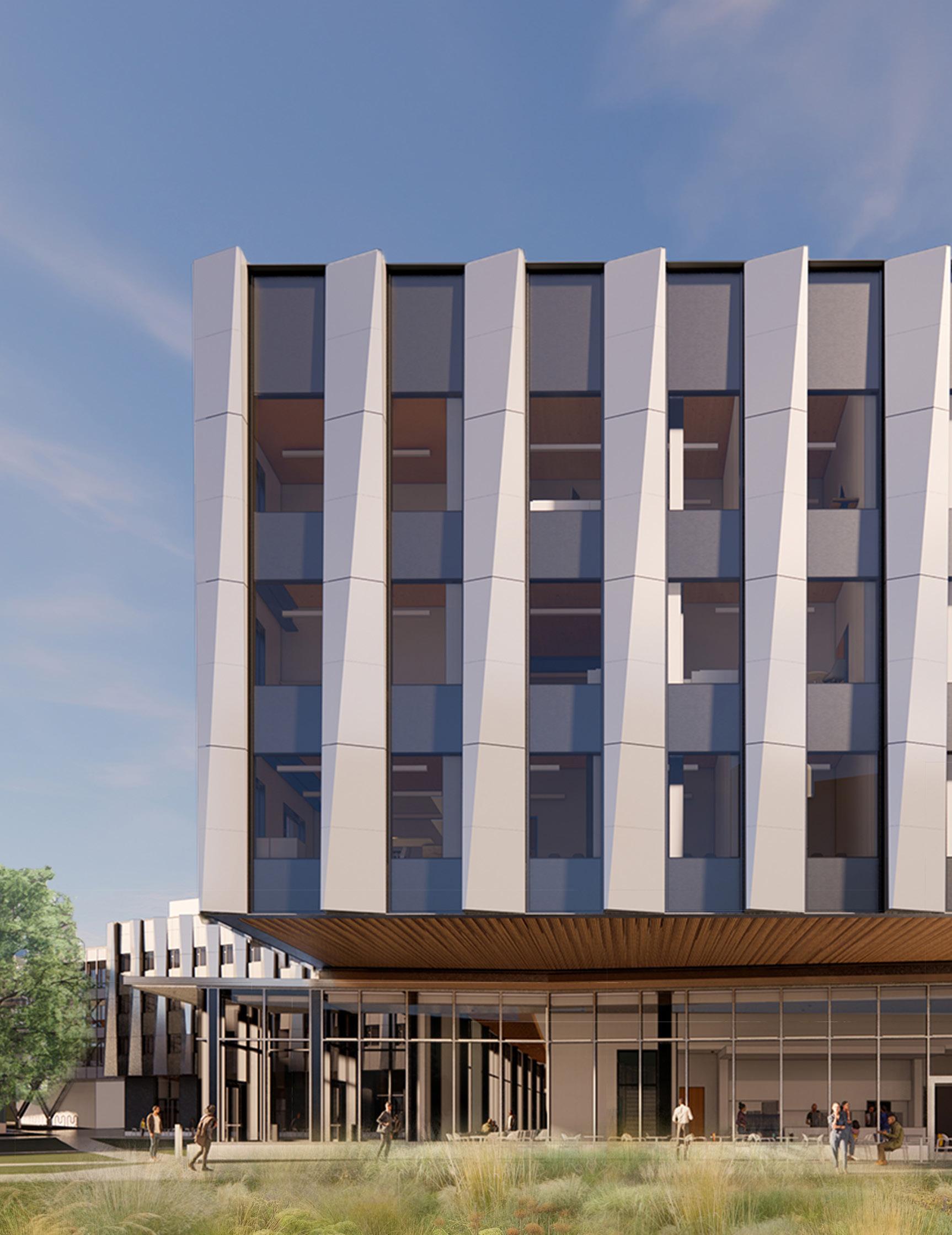 Adohi Hall creates a new residential college with emphasis on a creative live learn environment within a relaxed, informal, tree-lined landscape that reconceptualizes university housing.