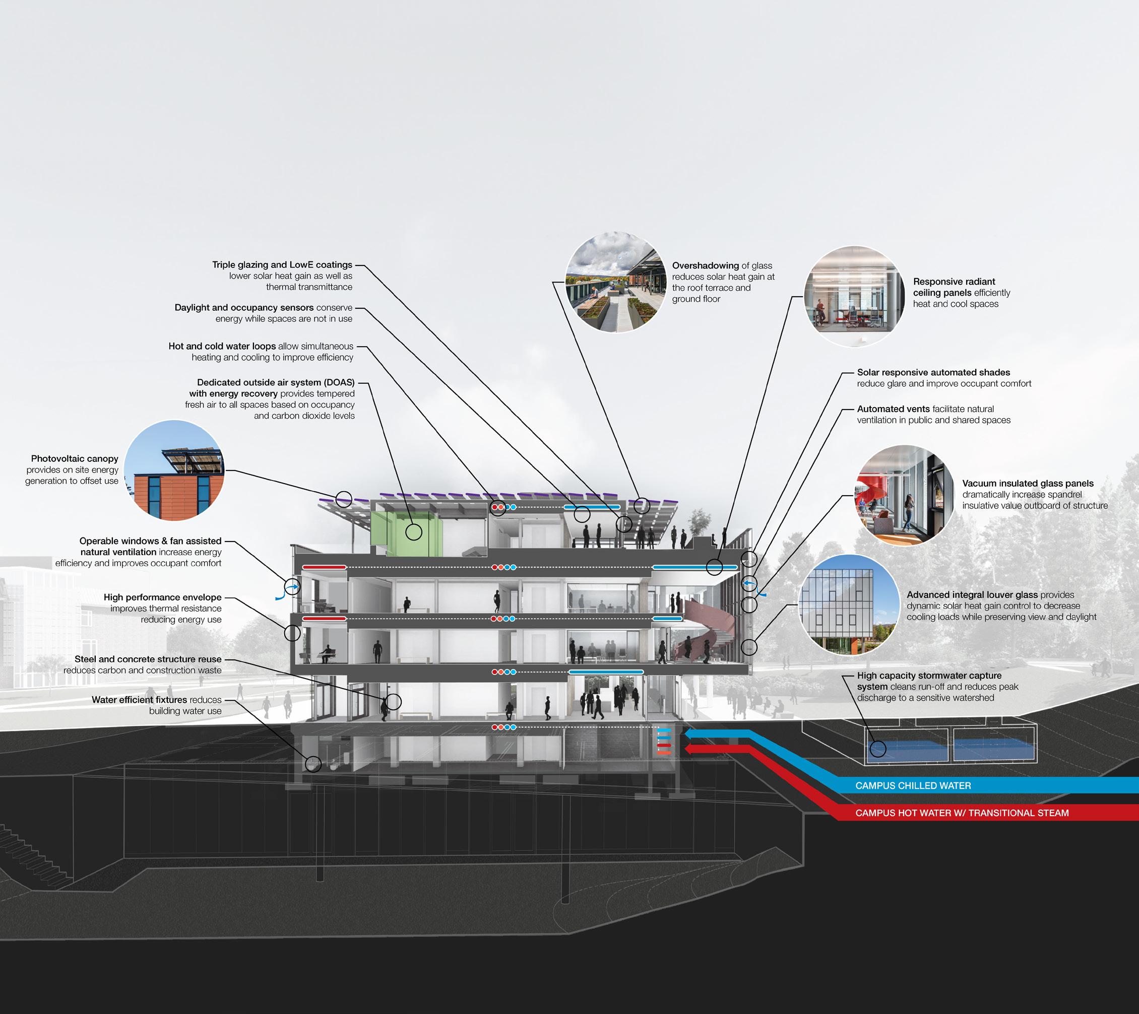 Providing a “visual learning” element to the engineering quadrant community, the building has ground level perimeter glazing that showcases its interior operations and equipment to passersby, offering “technology on display” through the glazed base of the building. The energy-efficient insulated panel system above is punctuated with channel glass strips, illuminating the upper equipment platform. The glazed base is highest on the north to allow vehicle access through a glazed bi-fold door; the glazing head slopes down along the east, south and west for reduced solar gain on those orientations.