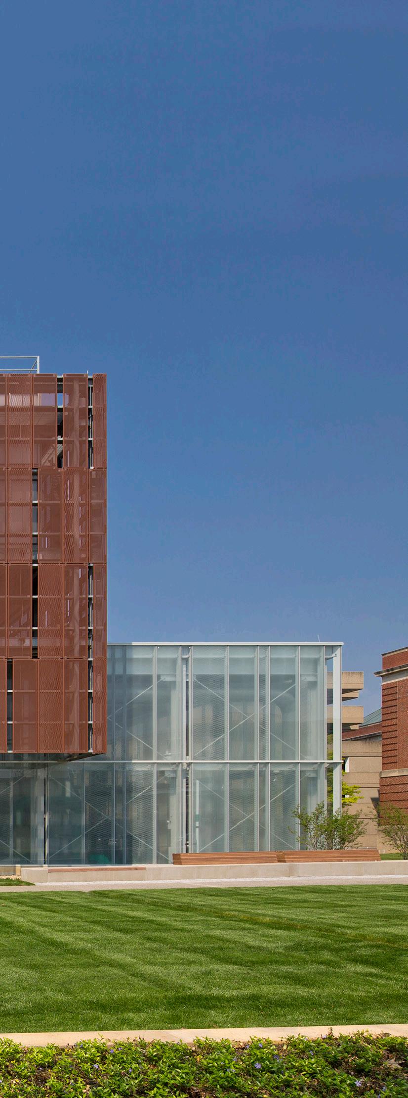 This iconic new structure introduces a large, critically important infrastructure facility to a mature campus, preserves an important green space at the campus edge, and frames the gateway for a new campus entry.