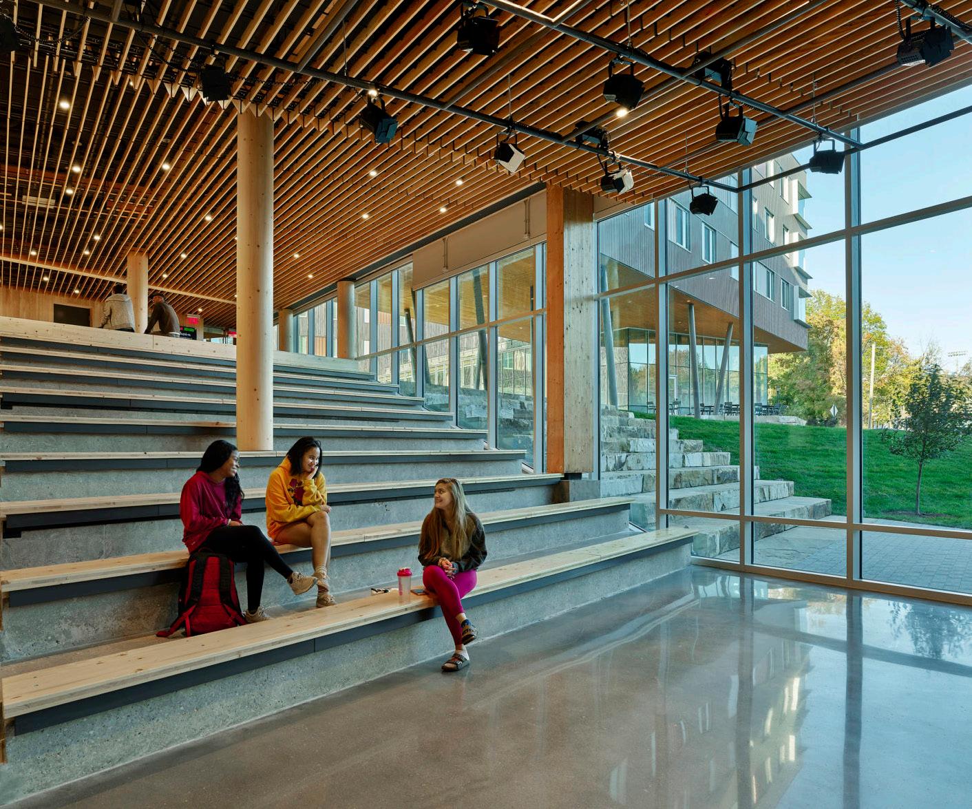 At the University of Massachusetts John W. Olver Design Building, AIA COTE Award Top 2020 winner, we developed the first major academic building built from mass timber, a new technology that allows for long floor spans and larger buildings to be able to be built with a wood structure. Wood has half the embodied energy of steel and one quarter the embodied energy of concrete making it a viable alternative for the construction industry. With the carbon sequestration properties of wood, the Design Building removes 2,681 metric tons of carbon from the atmosphere. Comprehensive life cycle analysis by the Athena Institute evaluated the complete energy used by the building –production, transportation, construction, maintenance and demolition – and found mass timber construction reduced carbon emissions by 13%, CFCs by 10% and non-renewable energy use by 15% compared to conventional construction.
