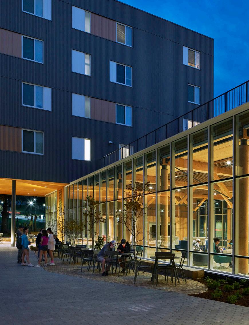 With a wide range of spaces shaped by wood - from student rooms, to quiet study lounges, to active learning work spaces and social communal spaces- Adohi Hall integrates the biophilic benefits of this natural, renewable material to shape the lives and enhance the education of students from the very private to the most public settings. At the ground floor, the Creative Community spaces – a series of gathering areas, maker spaces, dance studios and performance areas -- cascade down the hill, with direct physical and visual connections to the outdoor courtyards. Outdoor areas invite activity and engagement, from the hammock grove in the northern courtyard, to the loose seating that spills out into the terraces around the central cabin social space, to the informal native beam stone.
