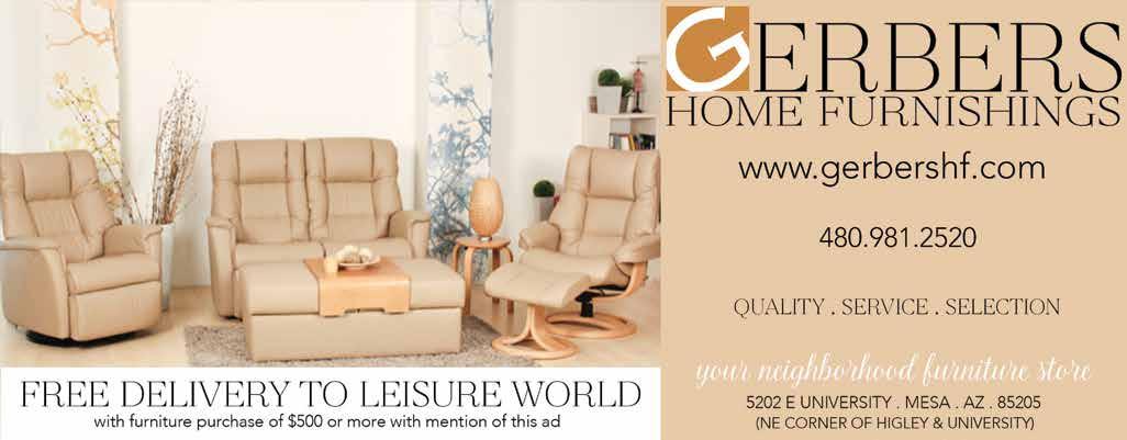 Family Owned & Operated A ordable Quality Dentistry Since 1924 LICENSED DENTURIST & ON-SITE DENTURE LAB EAST LOCATION 4830 E. MAIN ST • (480) 832-3335 WEST LOCATION 2415 W. MAIN ST • (480) 968-7777 WWW.DRPEASE.COM | DR.ERIKPEASE@GMAIL.COM SEE FLYER INSERT FOR MORE INFO AND COUPONS! The speed limit on Leisure World streets is 25 mph. No passing. Be vigilant at crosswalks! JULY 2023 | www.lwca.com THE OFFICIAL NEWS PUBLICATION OF LEISURE WORLD ARIZONA Plumbing Heating C ling YOUR HOME COMFORT SPECIALISTS FOR ALL SEASONS Servicing the Entire Valley 480-808-7125 westernstateshomeservices.com ROC HVAC #253810 • ROC PLUMBING #321722 S page A17 for special o ers! We hold these truths to be self-evident, that all men are created equal, that they are endowed by their Creator with certain unalienable Rights, that among these are Life, Liberty and the pursuit of Happiness. Happy 4th of July!