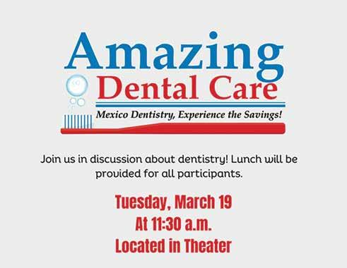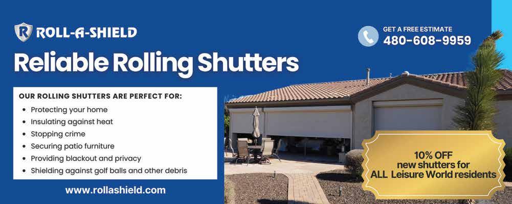 Family Owned & Operated A ordable Quality Dentistry from 1924-1924 LICENSED DENTURIST & ON-SITE DENTURE LAB EAST LOCATION 4830 E. MAIN ST • (480) 832-3335 WEST LOCATION 2415 W. MAIN ST • (480) 968-7777 WWW.DRPEASE.COM | DR.ERIKPEASE@GMAIL.COM SEE FLYER INSERT FOR MORE INFO AND COUPONS! 100th Anniversary The speed limit on Leisure World streets is 25 mph. No passing. Be vigilant at crosswalks! MARCH 2024 | www.lwca.com THE OFFICIAL NEWS PUBLICATION OF LEISURE WORLD ARIZONA NEWS Servicing the Entire Valley 480-808-7125 westernstateshomeservices.com ROC HVAC #253810 • ROC PLUMBING #321722 ENJOY SPRING SPECIALS! YOUR COOLING, HEATING & PLUMBING SPECIALIST See page A21 for special offers!