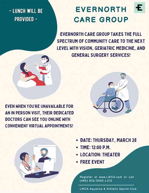 WHAT’S INSIDE FOR ADVERTISING INFORMATION: 480-307-6058 or sannunziato@lwca.com DEADLINE FOR ADS: 15th of month The acceptance of advertising in LW News does not constitute an endorsement or approval of any products or services by LWCA or management. DEADLINE FOR ARTICLES: 10th of month submitted to news@lwca.com Janet and James Freeman 276 Wayne & Cathy Balmer 1557 Sandra Londin 1942 Andrea Zwit 1789 Karen Kramer 1658 David & Charlene Shupp 2467 Warren & Allison Duff 2149 Richard Nicholson 1795 Andrea Williams 765 George & Sharon Howard 1399 Paul Hopkins & Ellen Annala 2691 Administration Reception Ext. 101 reception@lwca.com Allen Family Medicine LW On-Site Office 480-977-6349 Compliance Office Ext. 109 Facilities Department Ext. 109 facilities@lwca.com Finance Department Ext. 119 finance@lwca.com Fitness Center Ext. 212 fitness@lwca.com Golf Coyote Run: Ext. 300 Heron Lakes: Ext. 400 Golf Course Conditions 480-832-0005 Landscape Department Ext. 201 landscape@lwca.com Library Ext. 128 LW News/Communications Ext. 117 news@lwca.com Social Services Office Ext. 126 outreach@lwca.com Recreation Department Ext. 209 recreation@lwca.com RE/MAX Classic Ext. 705 Resource Office Ext. 126 resources@lwca.com Security Department Opt. 1 security@lwca.com LWCA DIRECTORY HELP US KEEP COSTS DOWN: ONE COPY OF LW NEWS PER RESIDENT PLEASE. Welcome New Owners Celebrate Your Golden Years at Copper Springs! Redefine your golden years in a community that seamlessly blends comfort, elegance, and vibrant social living. Chef-inspired cuisine, all-inclusive services, and a wealth of enriching activities are specially designed to curate a fulfilling retirement lifestyle without the worry of long-term leases, hidden fees, or unpleasant surprises. 3303 East Gary Way Gilbert, AZ 85234 CopperSpringsRetirement.com 480-420-0768 Copper Springs Tour Today! Experience our Signature Freedom Dining program for yourself! Schedule a private tour and be our guest for a fabulous meal. Call today to plan your visit!