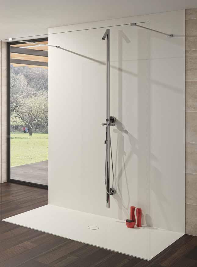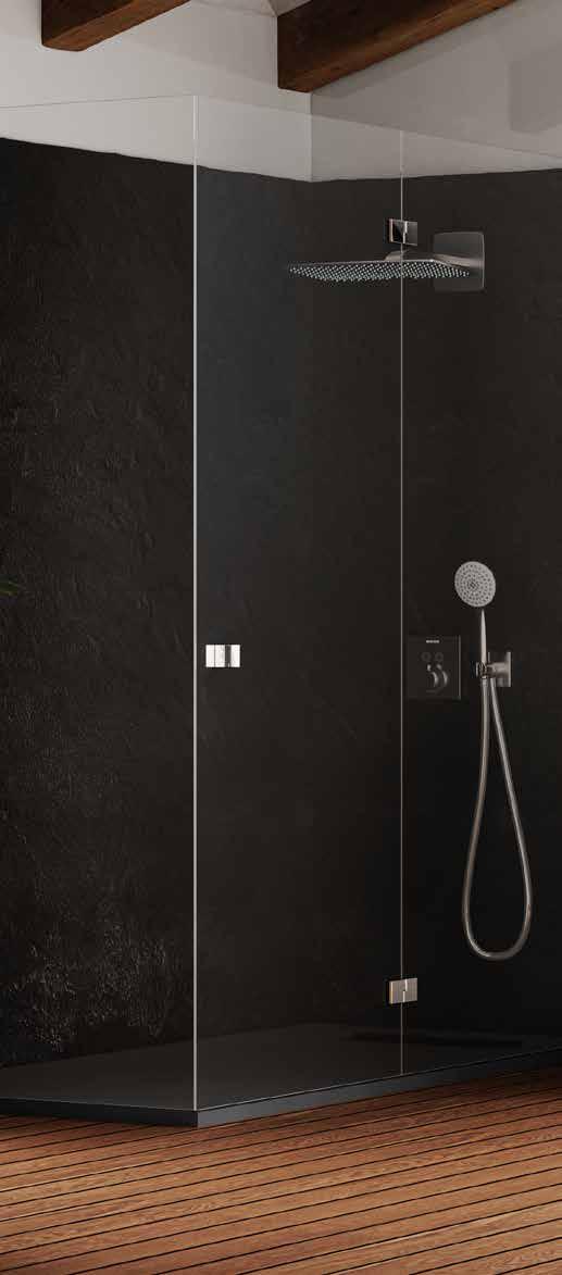 F01 Gloss White, SMO277 Safari. Mirrors MODCURMI. UNIVERSAL PLUS Shower Tray, ELEGANCE Wall Panels and ZSIED seat. Colours SMO277 Safari.