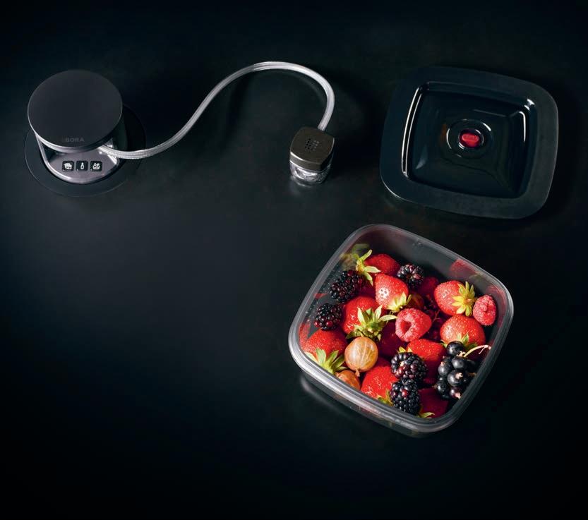 Make food last up to three times longer and reduce waste with the BORA QVac built-in vacuum sealer. Vacuum sealing retains both the food’s delicious taste and its appetising appearance. The BORA QVac has three functions: vacuum sealing in vacuum boxes and vacuum bags, resealing bottles and marinating. The BORA QVac vacuum sealing set comes in two different designs that can be installed in almost any kitchen: Stainless Steel and All Black.