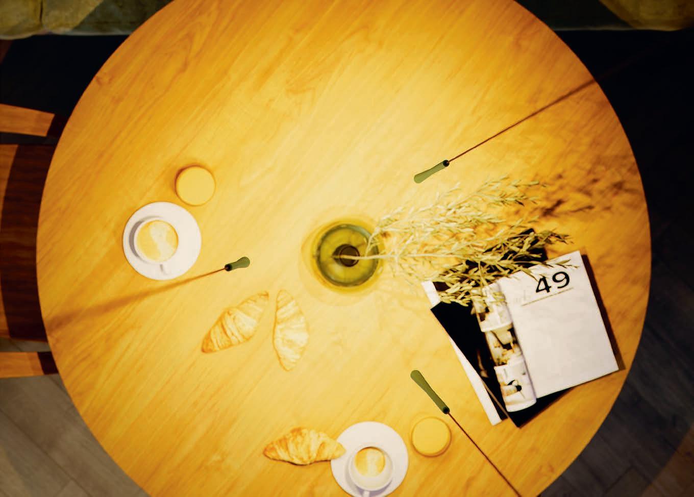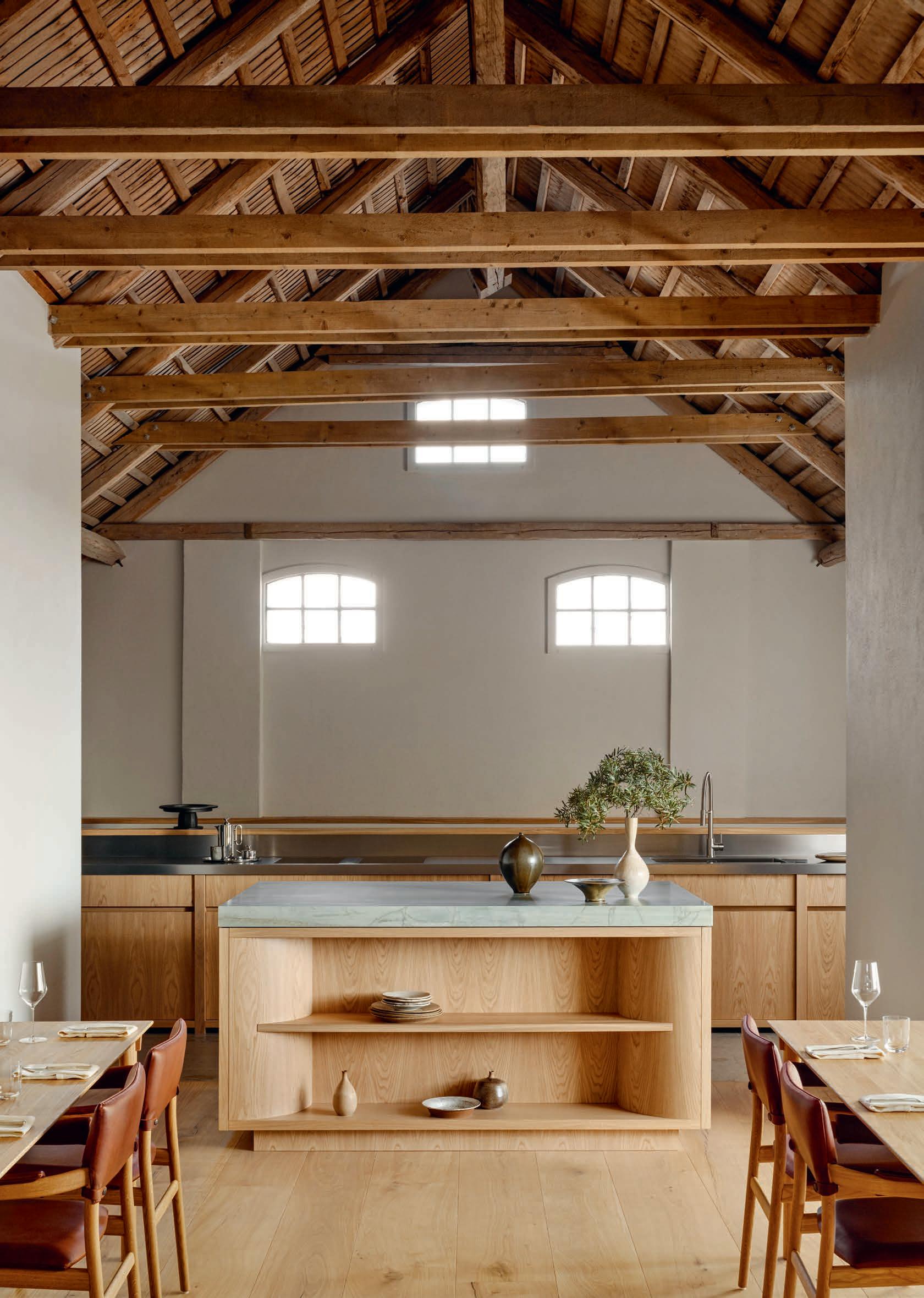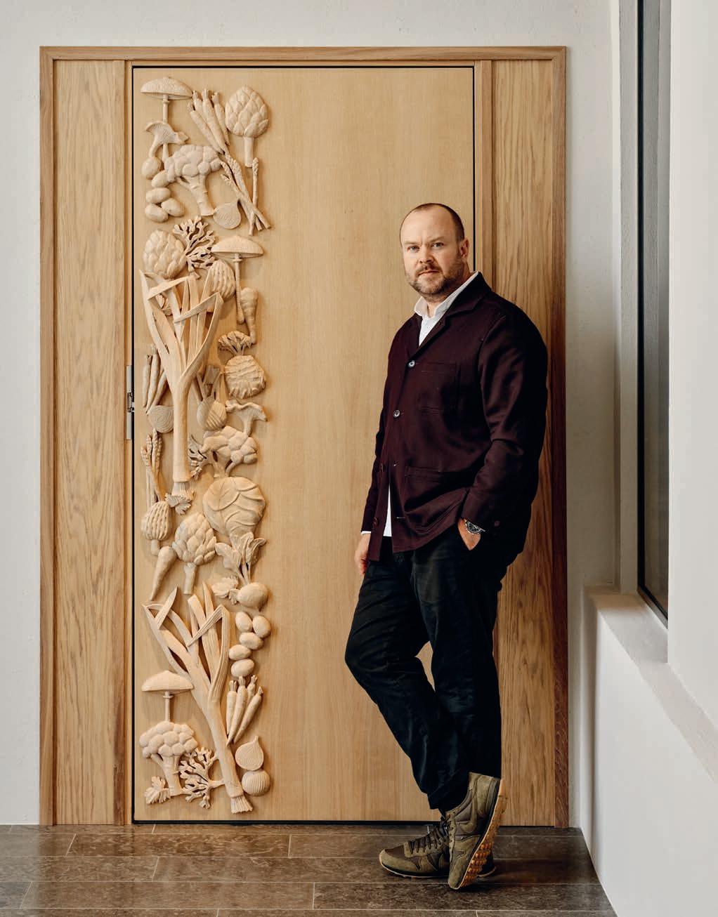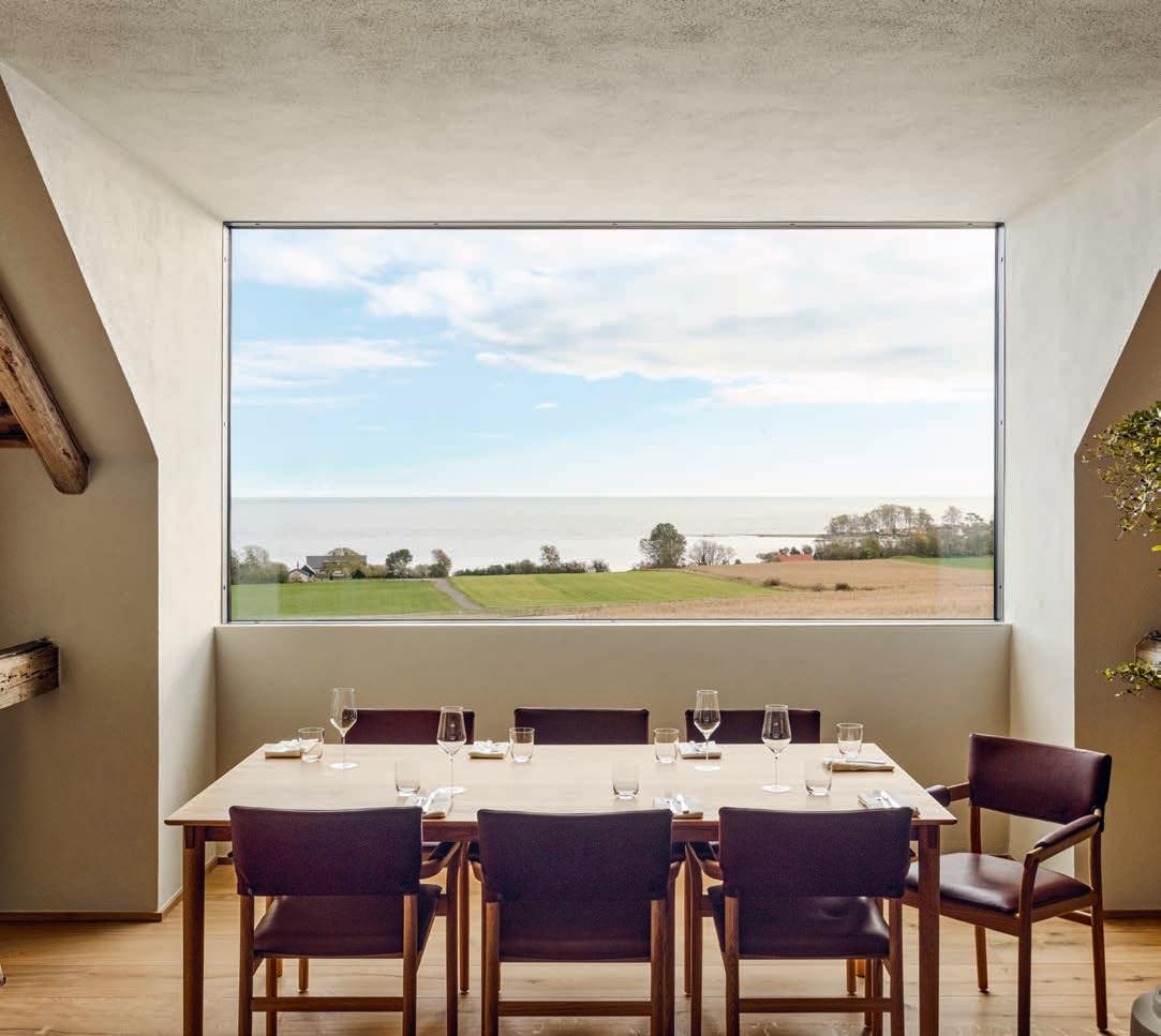 There’s a hint of salt in the air in the picturesque hills. Here in Skåne, in the Österlen region on the south-east coast of Sweden, you simply can’t miss the vast landscape. In the midst of this idyllic setting lies the top restaurant Vyn –a Swedish word that translates as ‘view’, and the restaurant certainly lives up to its name. Opened in autumn 2023, it is located in a former farm on the top of a hill, surrounded by 18 hectares of land and offering a magnificent view of the cobalt blue waters of the Baltic Sea. The light-coloured oak entrance door, artistically adorned with sculpted vegetables, makes it clear that this is a place of culinary delights. Huge windows frame the setting like living paintings, flooding the rooms with natural light. In the private dining area, which seats up to 24 people, Berlin and his team make the season’s taster menu within arm’s reach of their guests. An inviting kitchen island with a thick quartzite worktop, subtly infused with green accents, fully captures the eye. And when the master chef draws on his dedication, passion and creativity to serve up culinary works of art, it becomes the heart of the action.