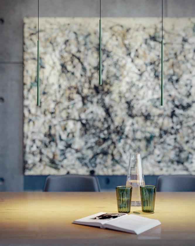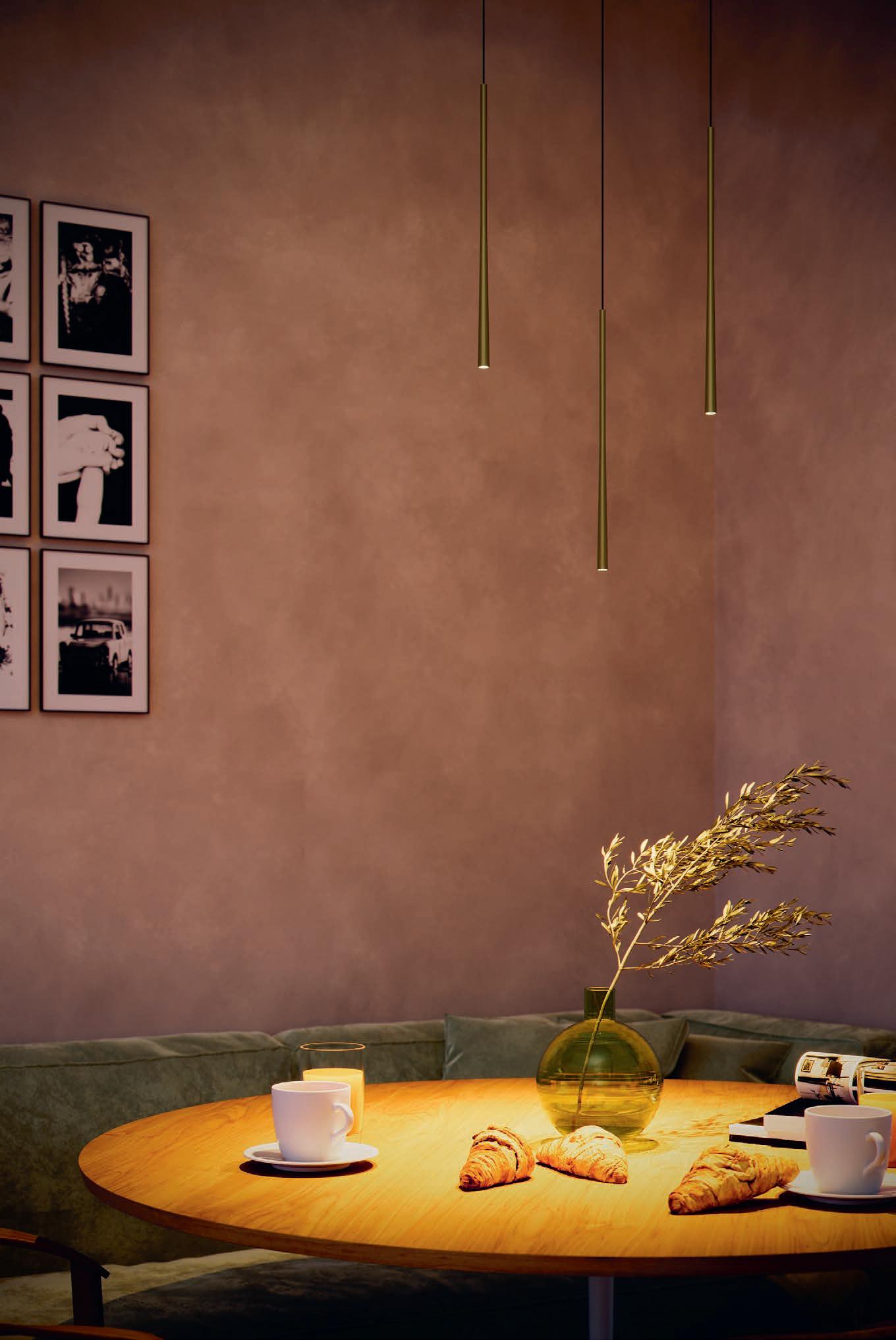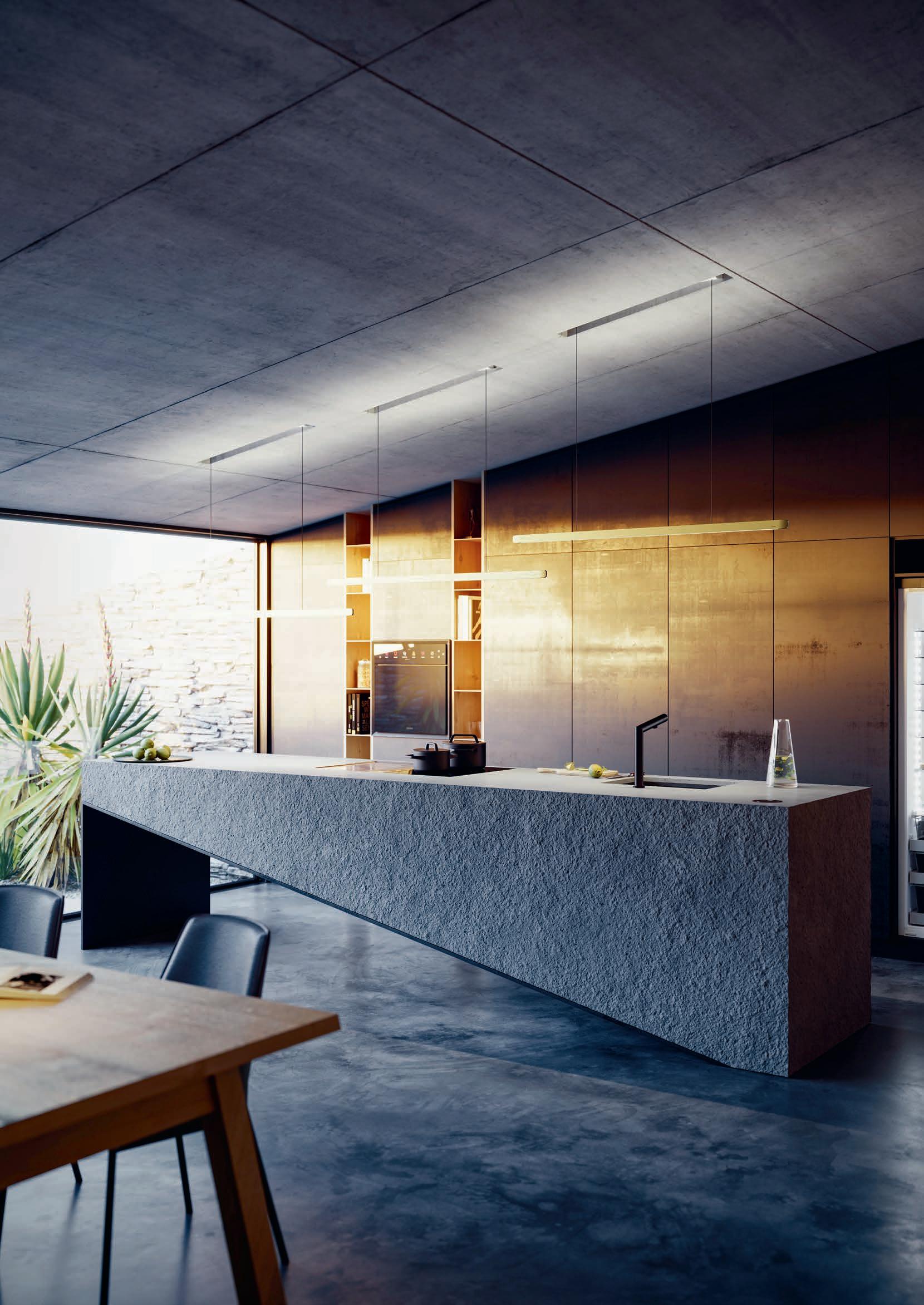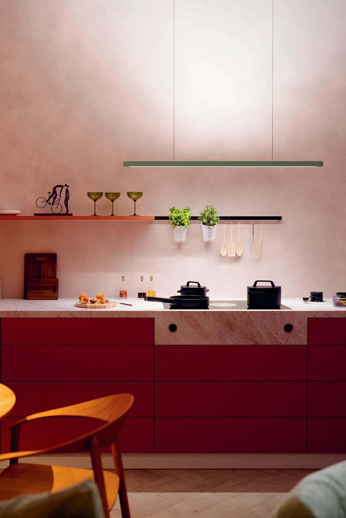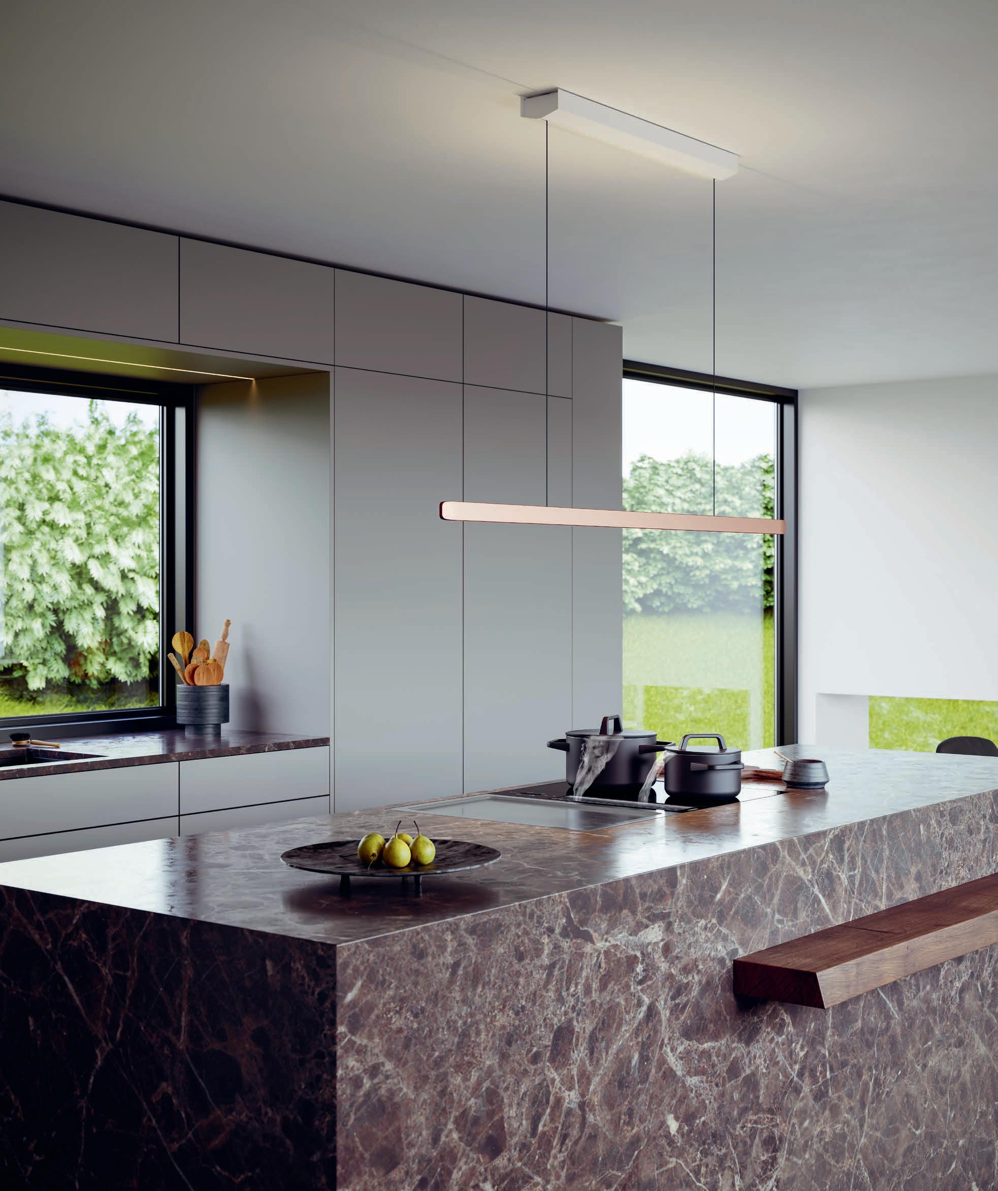 The linear pendant light can be used as either an indirect ambient light above the dining table or a direct light source above a cooktop. The two light sources can be controlled separately.