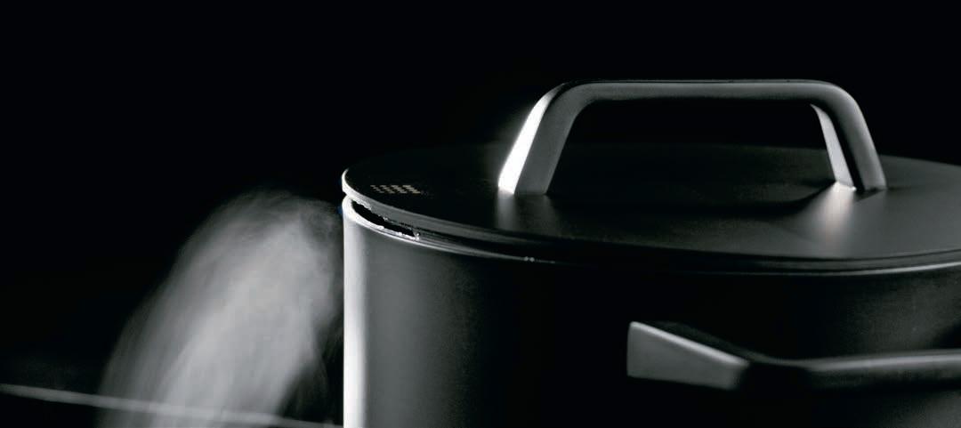 ergonomics, all of our pots and pans also feature stay-cool handles. The subtle pouring rim is a visual highlight and makes it easy to pour liquids without spilling them. The BORA tiltable lid can be opened with a simple hand movement to effectively direct the steam straight into the BORA cooktop extractor. The pot set, frying pan and braising pan are easy to clean, can be stacked to save space during storage and are compatible with all conventional cooktop types.