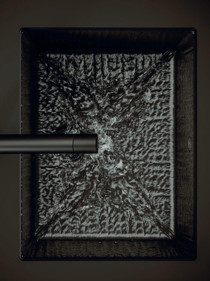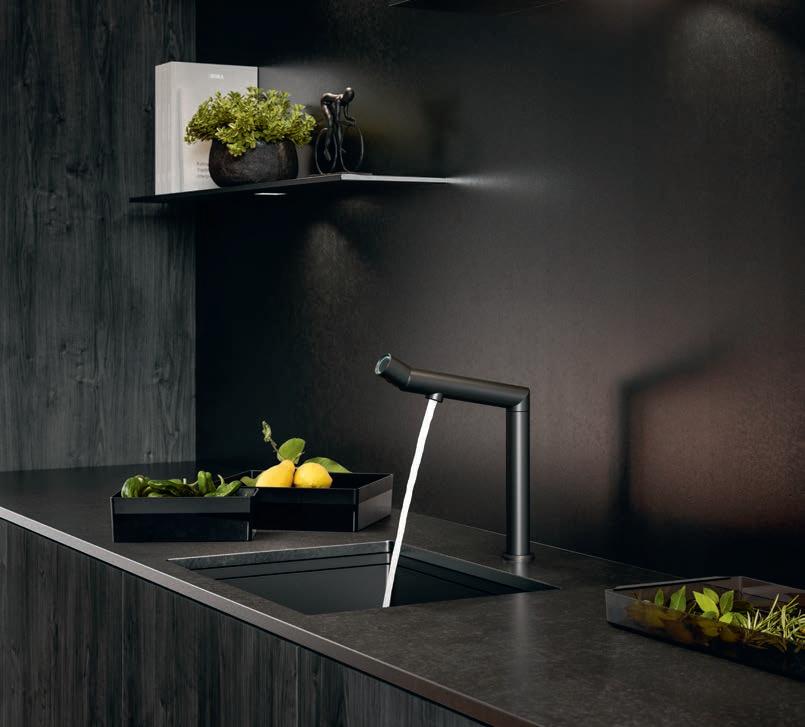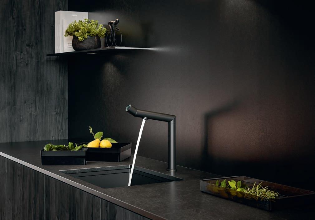 Precise edges define the jet black sink and tap. With their pared-down design, the tap and sink do not feature any other operating elements so as to offer a holistically streamlined operating concept. The sink’s overflow is positioned on the non-visible side of the basin to provide an undisturbed view of the jet black finish. The tap impresses with its slender, unobtrusive shape and clean design language.
