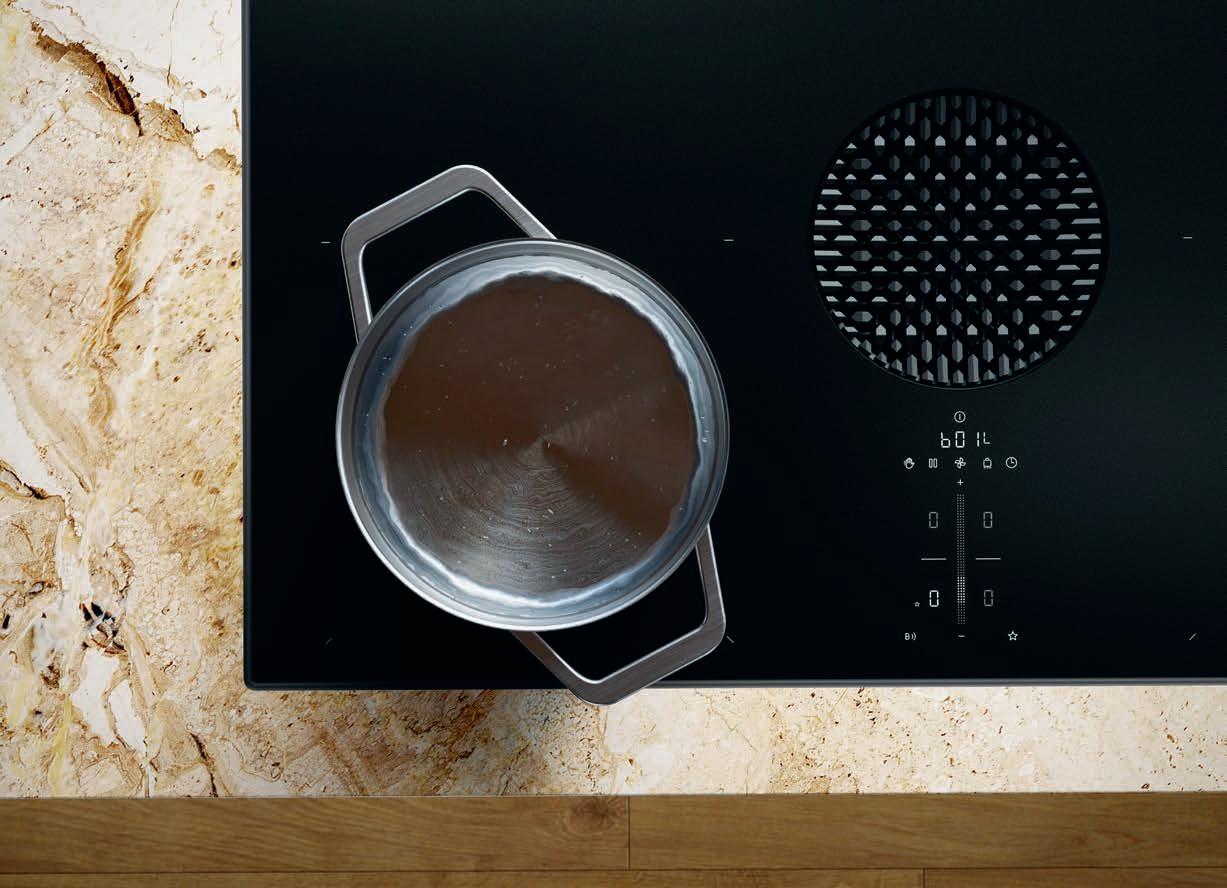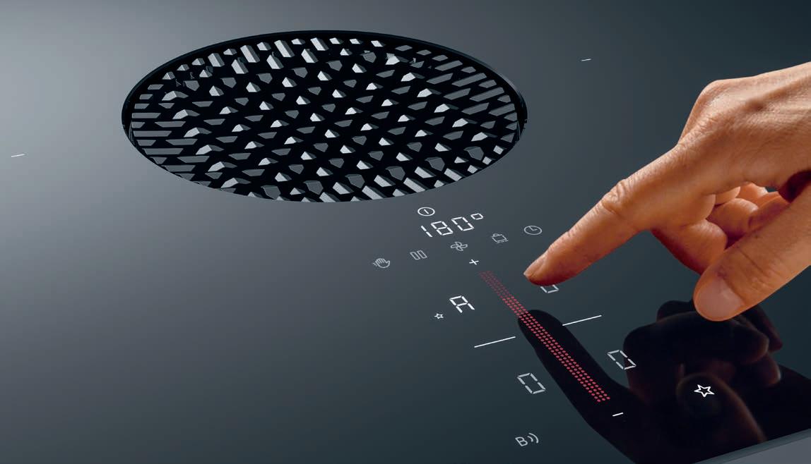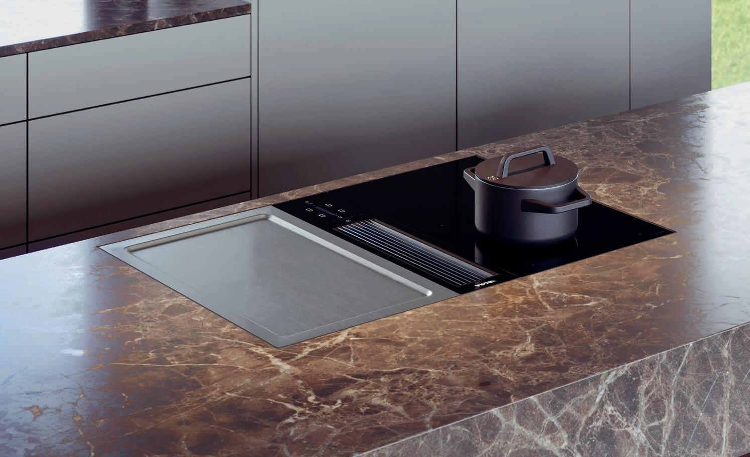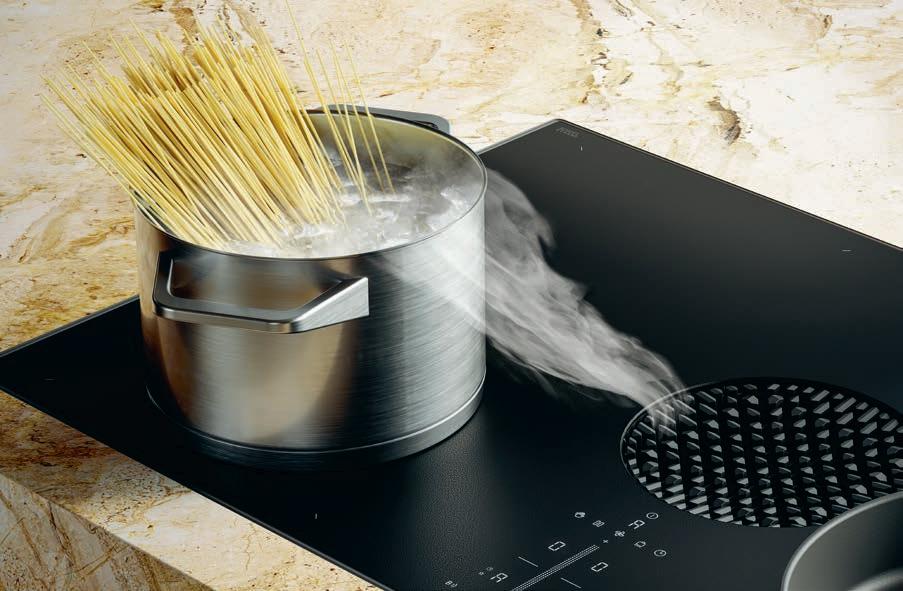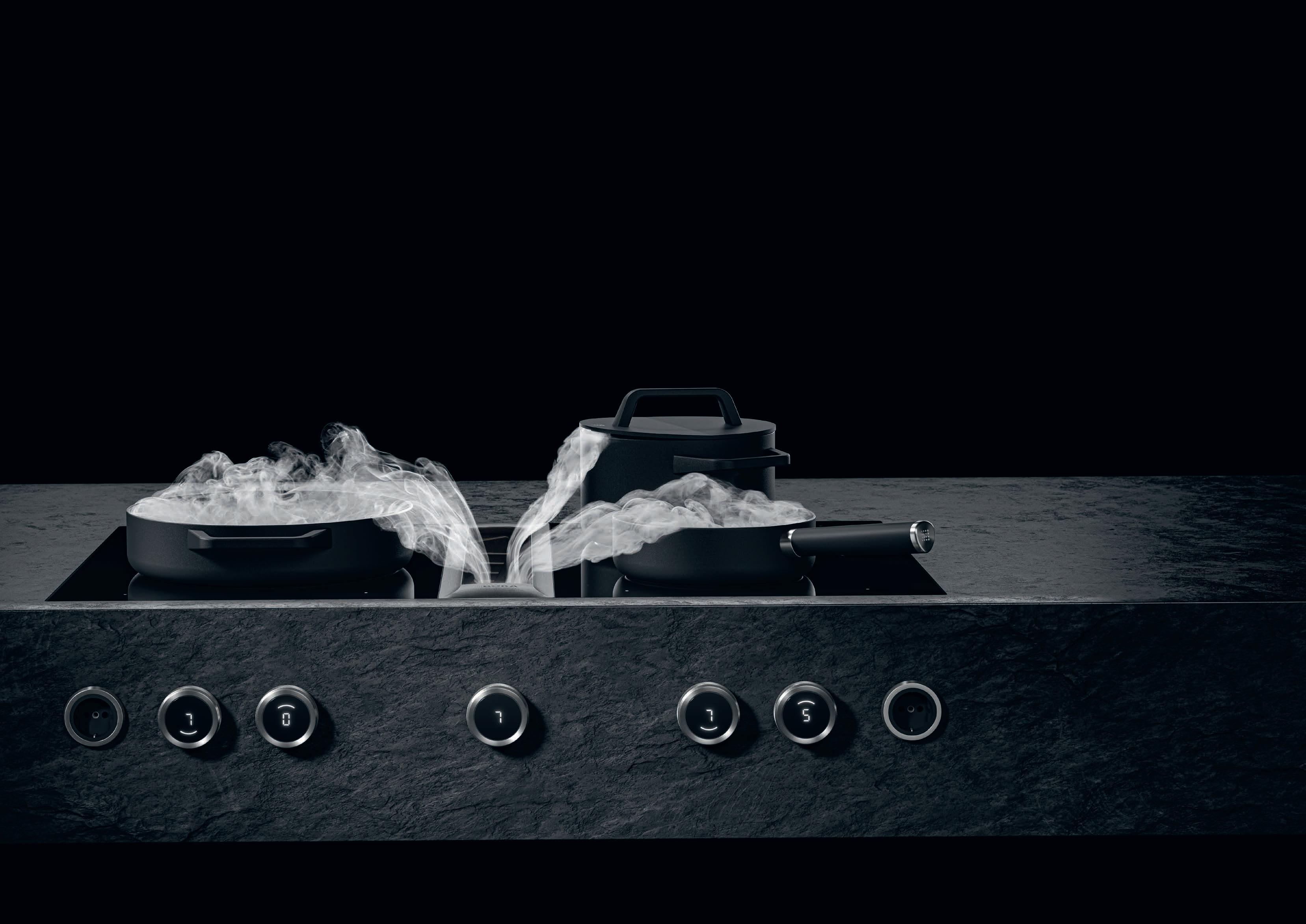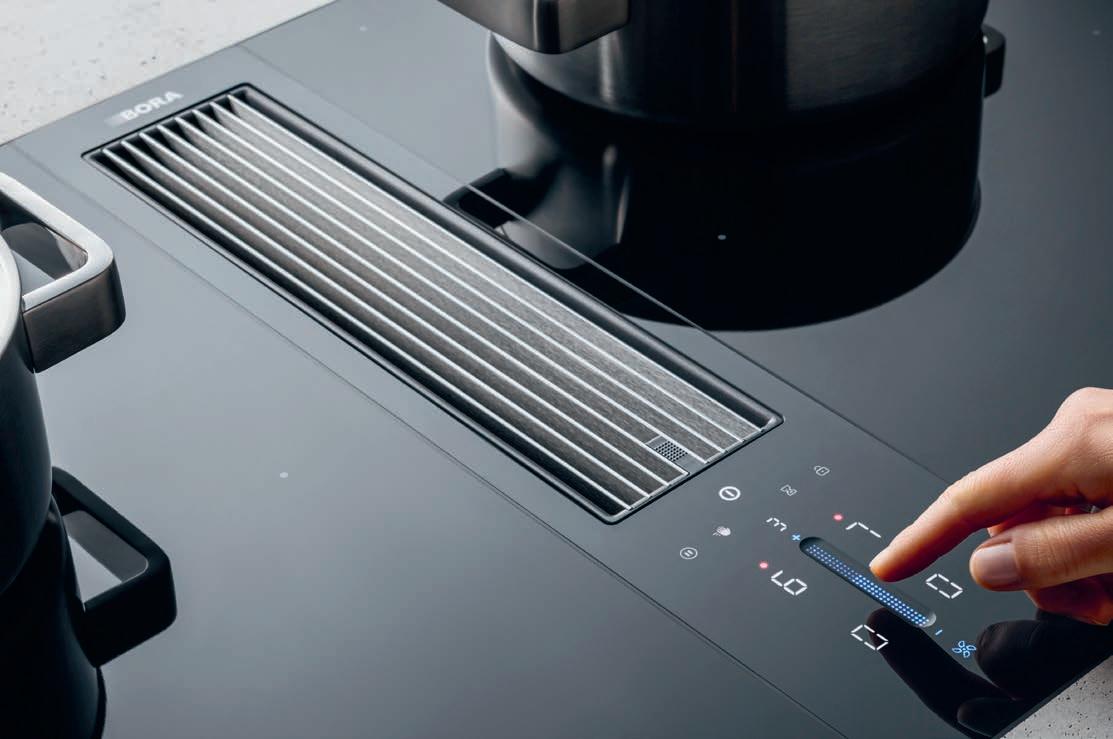 BORA cooktop extractor systems draw vapours downwards at around four metres per second. This generates a cross flow which is greater than the speed at which the cooking vapours rise and effectively extracts steam and odours downwards.