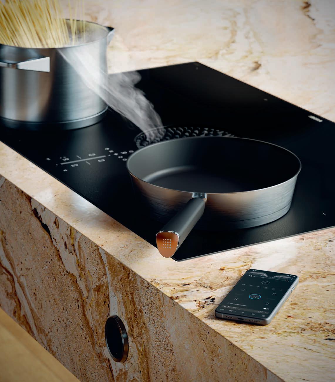 The BORA Pots and Pans Assist range is perfectly designed for use with the new BORA X Pure’s appliance-specific functions. This makes cooking with BORA even simpler than ever. The Assist functions Fry (with temperaturespecific settings for frying) and Boil (for boiling water) can be used directly from the cooktop. Further Assist functions and recipes can be started via the BORA JOY app.