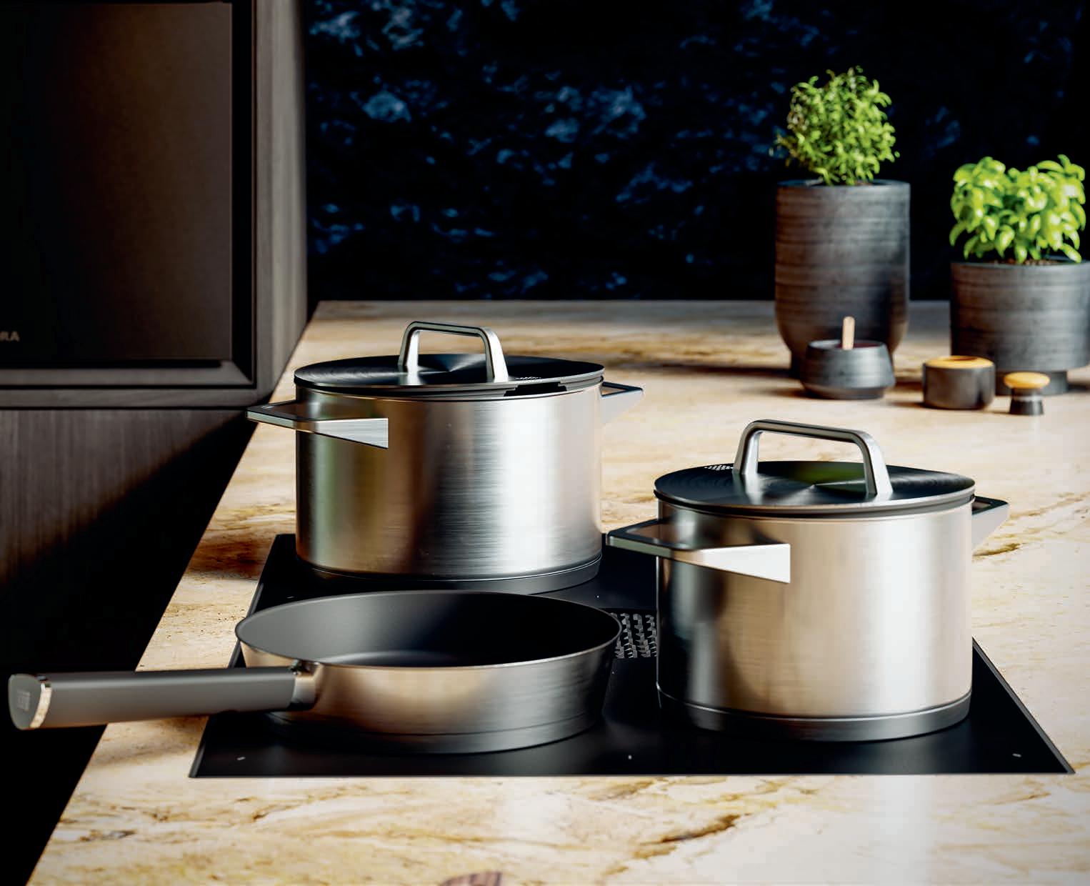 heat distribution as efficient as possible. Made using a 5-ply structure, finished with jet black, non-scratch, silicone-coated polyester and embellished with a stainless steel edge, we are setting new standards for durability, even heat distribution and simple cleaning. The pots and pans set and the braising pan can be stacked to save space during storage and are compatible with all conventional cooktop types.