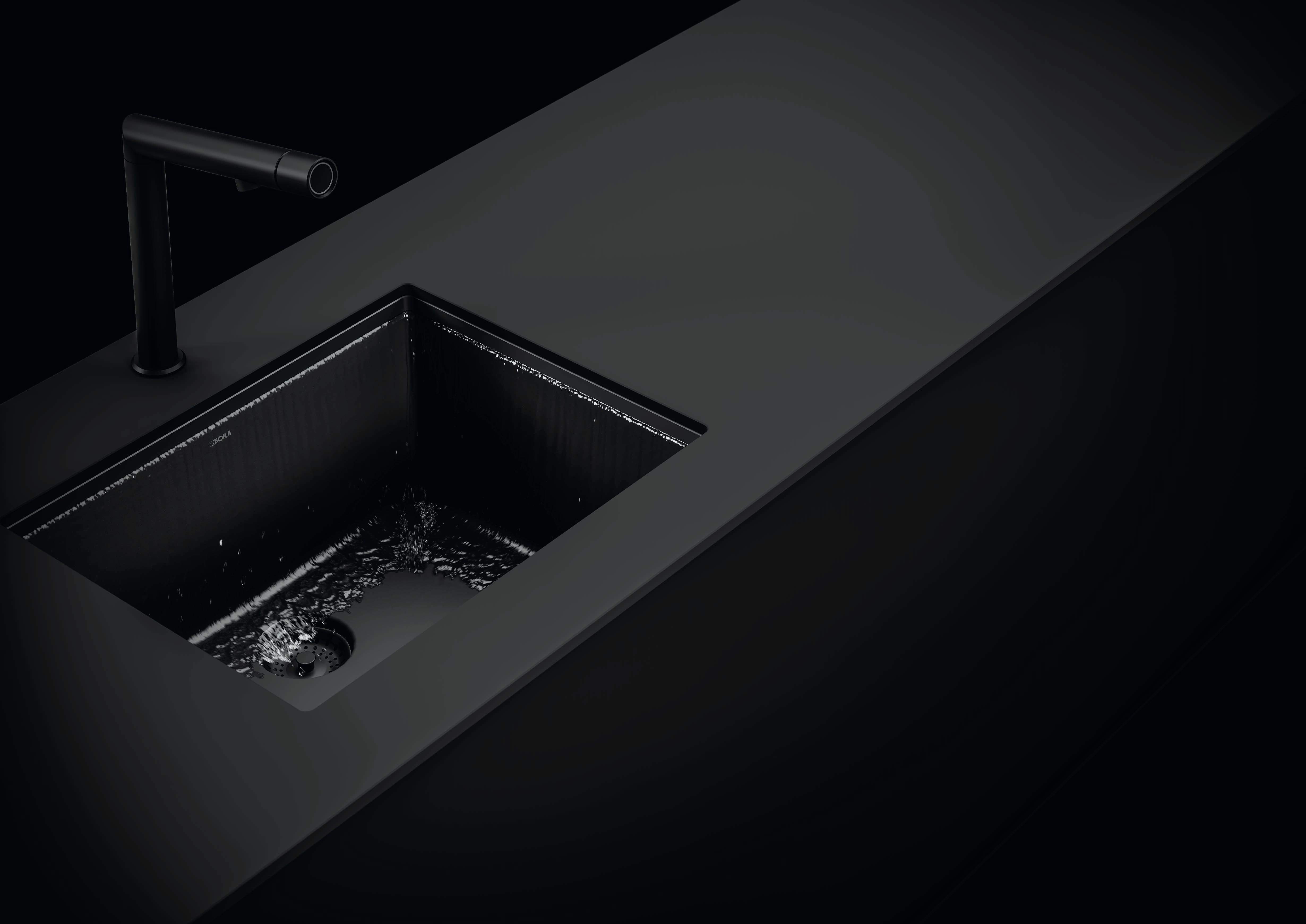 Automatically clean. The BORA Sink cleans itself at the push of a button. Water rinses impurities and dirt off all the surfaces into the drain without leaving any residues. The automatic sink cleaning function is made possible by a combination of the innovative flow profile and the sink’s pearling effect. The durable quartz composite sink is made from ultra-modern, patented Cristadur. This has an impressive, satin-matt, seamless finish, which dirt and water simply roll off. At the end of the cleaning function, any excess dirt residues are simply removed with the drain filter and disposed of. As a mark of quality, the sink is manufactured in Germany by the industry specialist SCHOCK.