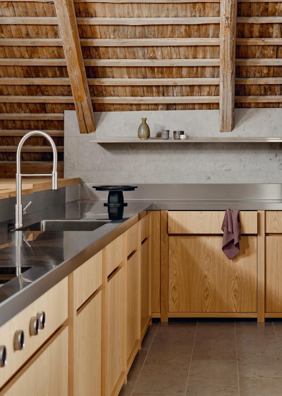 The Scandinavian-style interior also reflects the connection with nature. The warm, light oak and clean lines of the kitchen contrast with the exposed, rustic beams beneath the roof of the former farmhouse. Thanks to the earthy tones, the modern minimalism creates a cosy and intimate atmosphere instead of appearing cold. Sounds like the sizzling of food in frying pans,