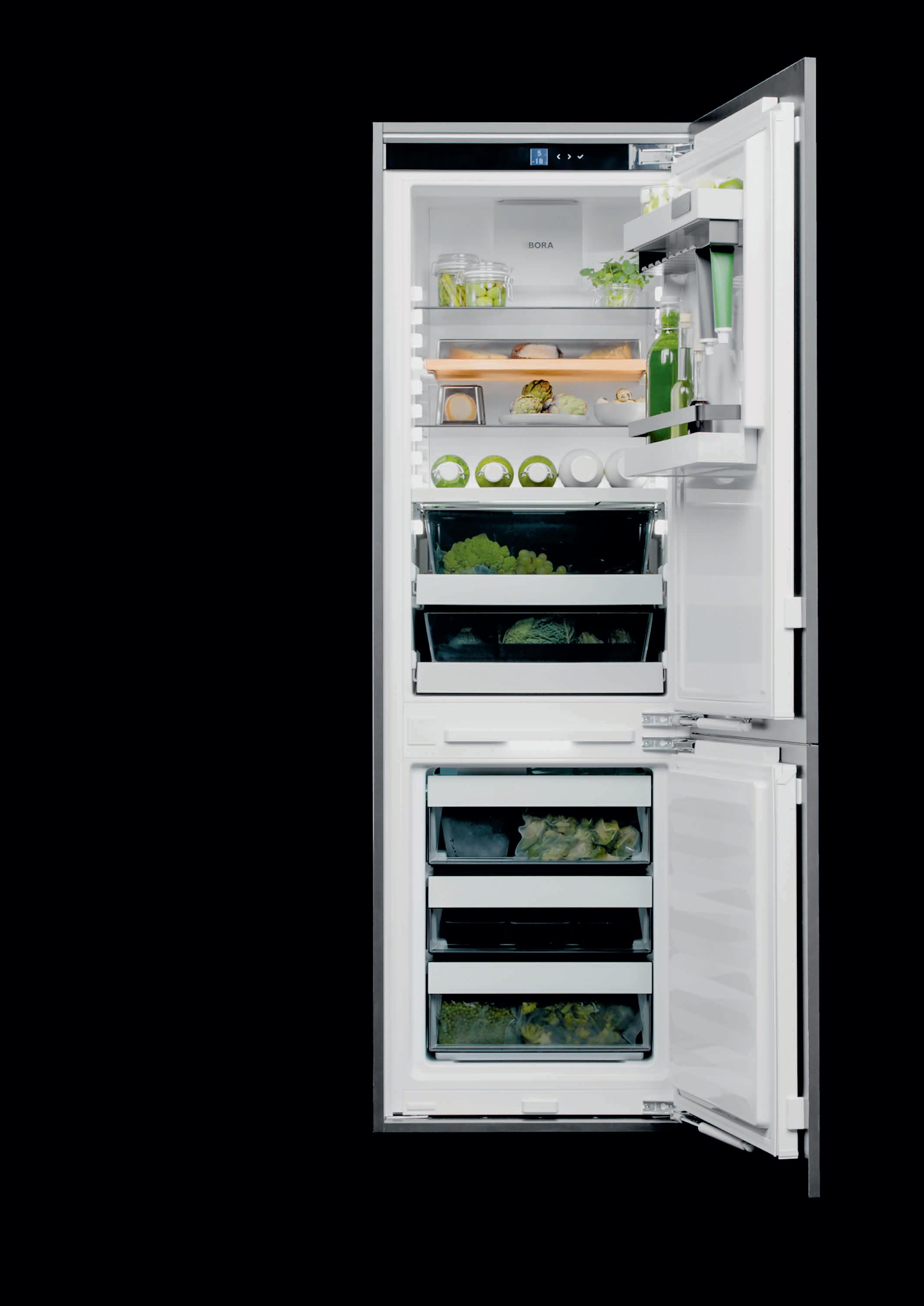 Correct storage at home plays a decisive part in the freshness and shelf life of your groceries and prepared meals. Sort the prepped batch ingredients for subsequent use to make meals, put them in separate containers and store them appropriately: dry food at room temperature, perishable food in the refrigerator or freezer. BORA refrigeration and freezing systems offer the right temperature zones for all types of food. The BORA Fresh zero tray is ideal for loose fruit and vegetables, fish and (cured) meat. Food intended to be eaten in the near future should be stored nearest to the top. Prepped or pre-cooked food can be kept for up to four months by freezing it. With the right planning and storage, pre-cooking is as easy as pie.