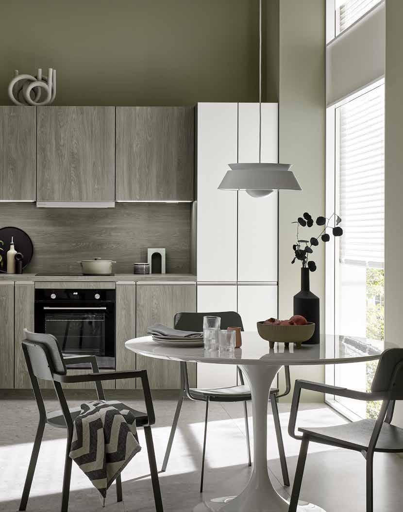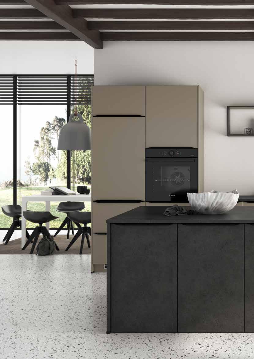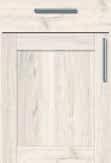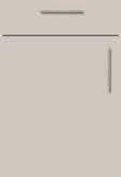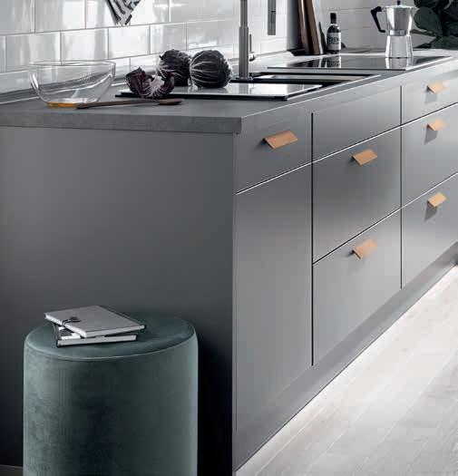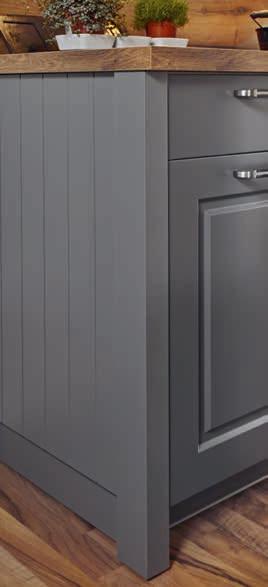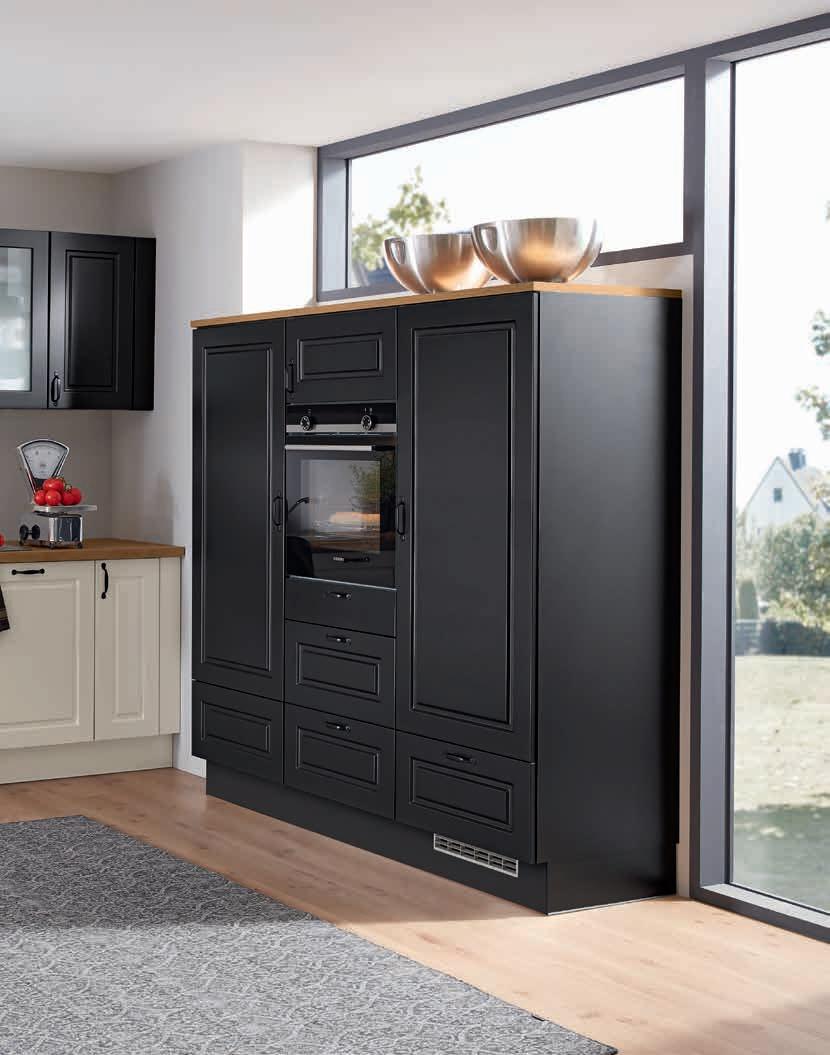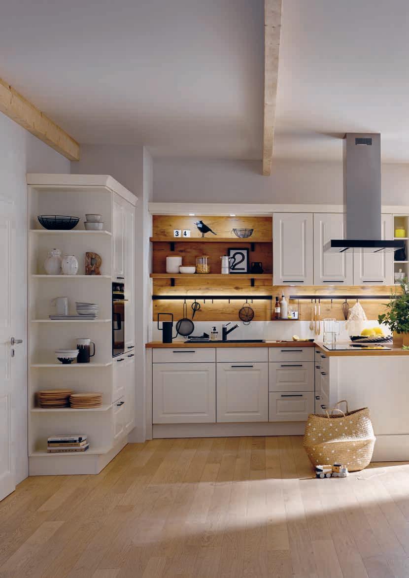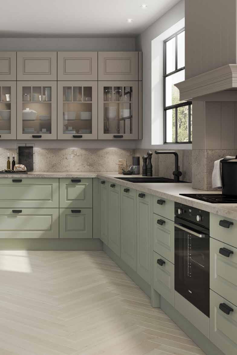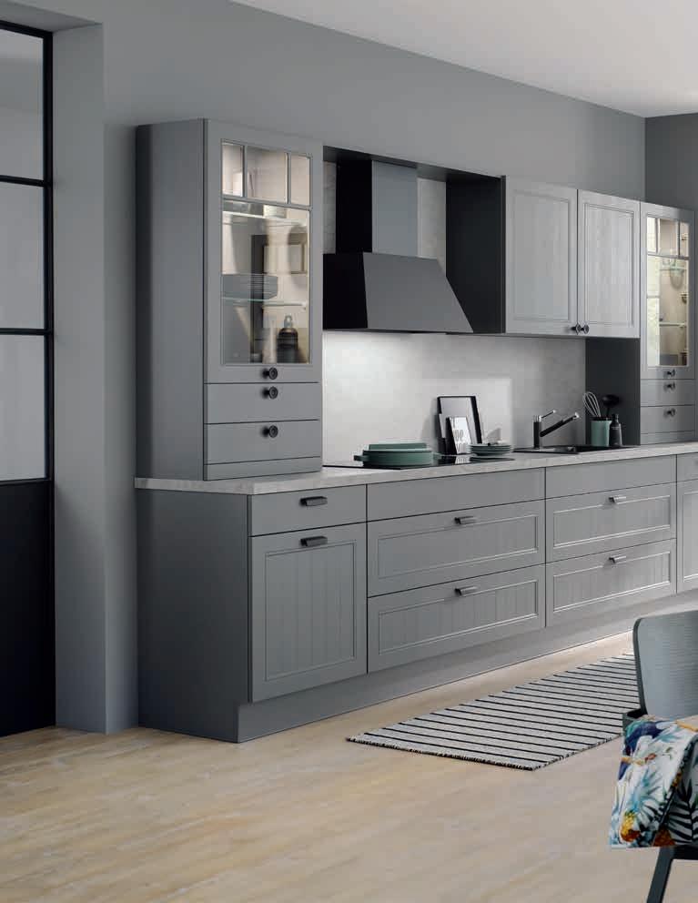 Ton sur ton : la façade à cadre laqué mat soyeux séduit par une finition artisanale méticuleuse en teinte grège discrète. Les poignées champêtres, les vitrines et les côtés visibles, façon panneaux, soulignent l’élégance du style Cottage.