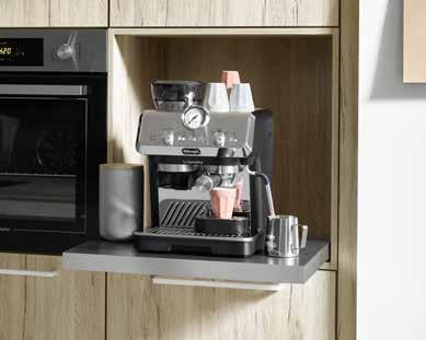 PRAKTISCH – de kookplaat met geïntegreerde afzuiging. De koffiemachine komt fijnproevers op een uittrekbaar plateau tegemoet. Een broodsnijmachine verschijnt desgewenst uit de lade eronder. Dit is comfortabel leven.