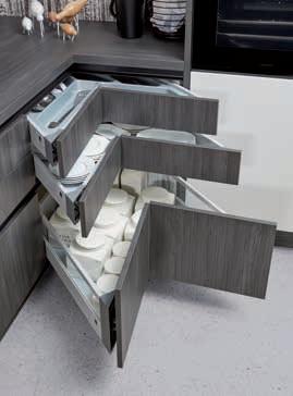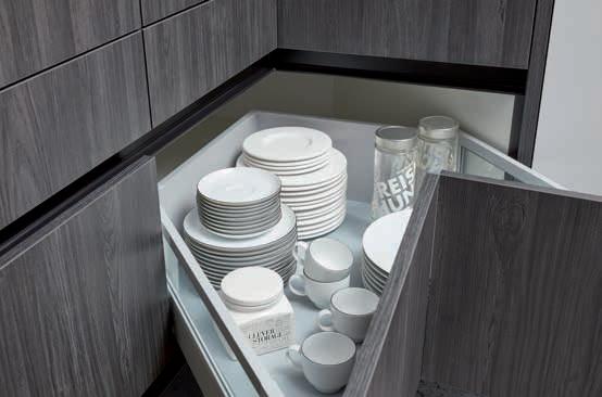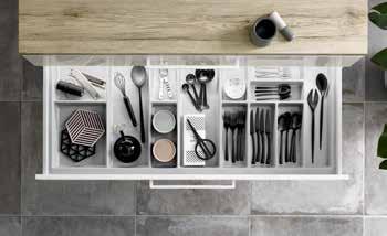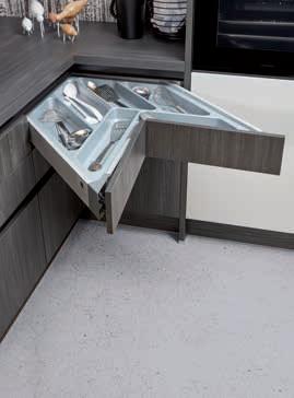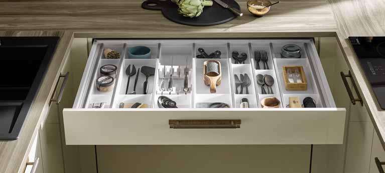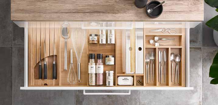 Of het nu gaat om het messenblok, ruimte voor kruiden of voor de 1000 andere dingen die het koken aangenamer maken: onze interieuruitrusting past zich aan uw wensen aan. Ze zijn verkrijgbaar in verschillende afmetingen en, op verzoek, met modulaire indeling op maat. Van echt hout of hoogwaardige kunststof.