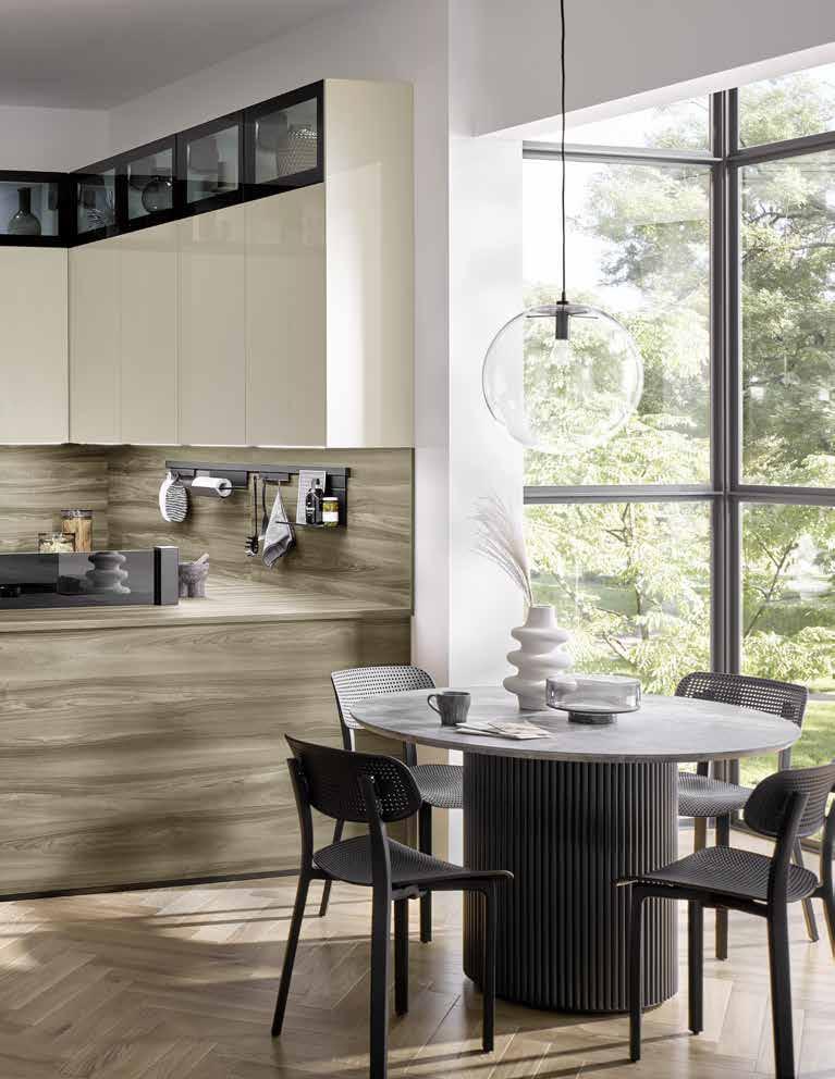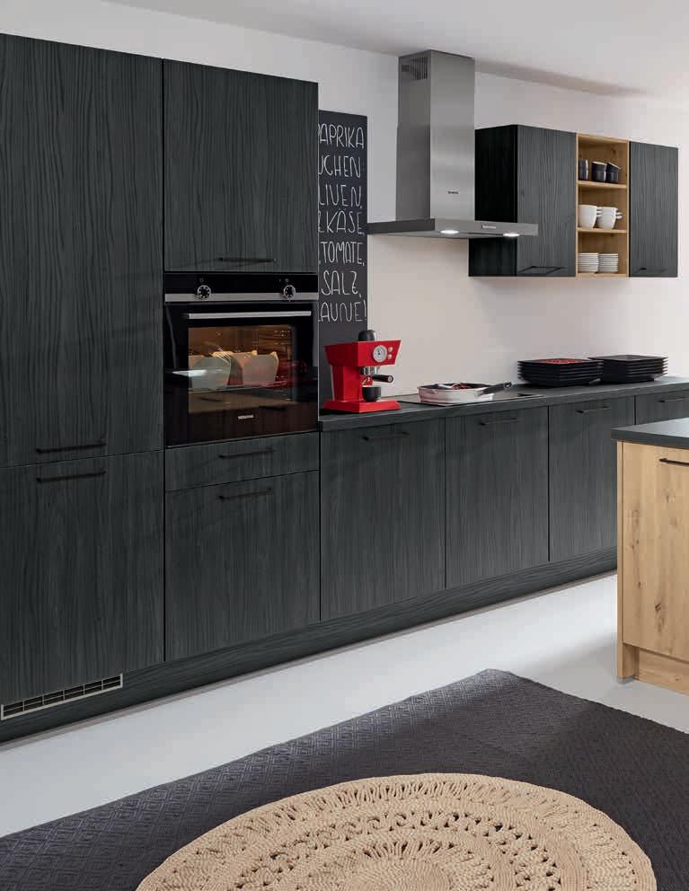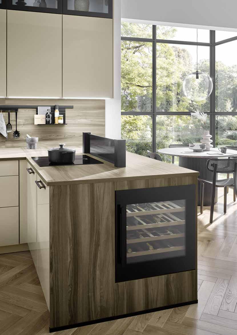 Klappenschränke mit Rauchglastüren bilden einen krönenden Abschluss. Der Spritzschutz Connect am Kochfeld greift das Design auf und verfügt über praktische Steckdosen. Genießer freuen sich über den Komfort eines Weinkühlschranks.