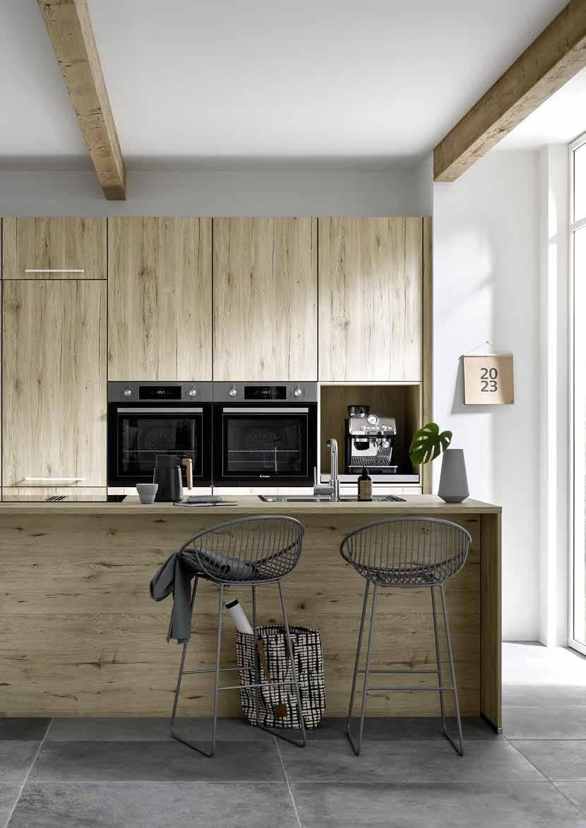 Les meubles à abattants, équipés de portes en verre fumé, subliment l’aménagement. Munie de prises femelles pratiques, la plaque antiprojection Connect derrière la table de cuisson reprend le design de la cave à vin qui fera le bonheur des gourmets.