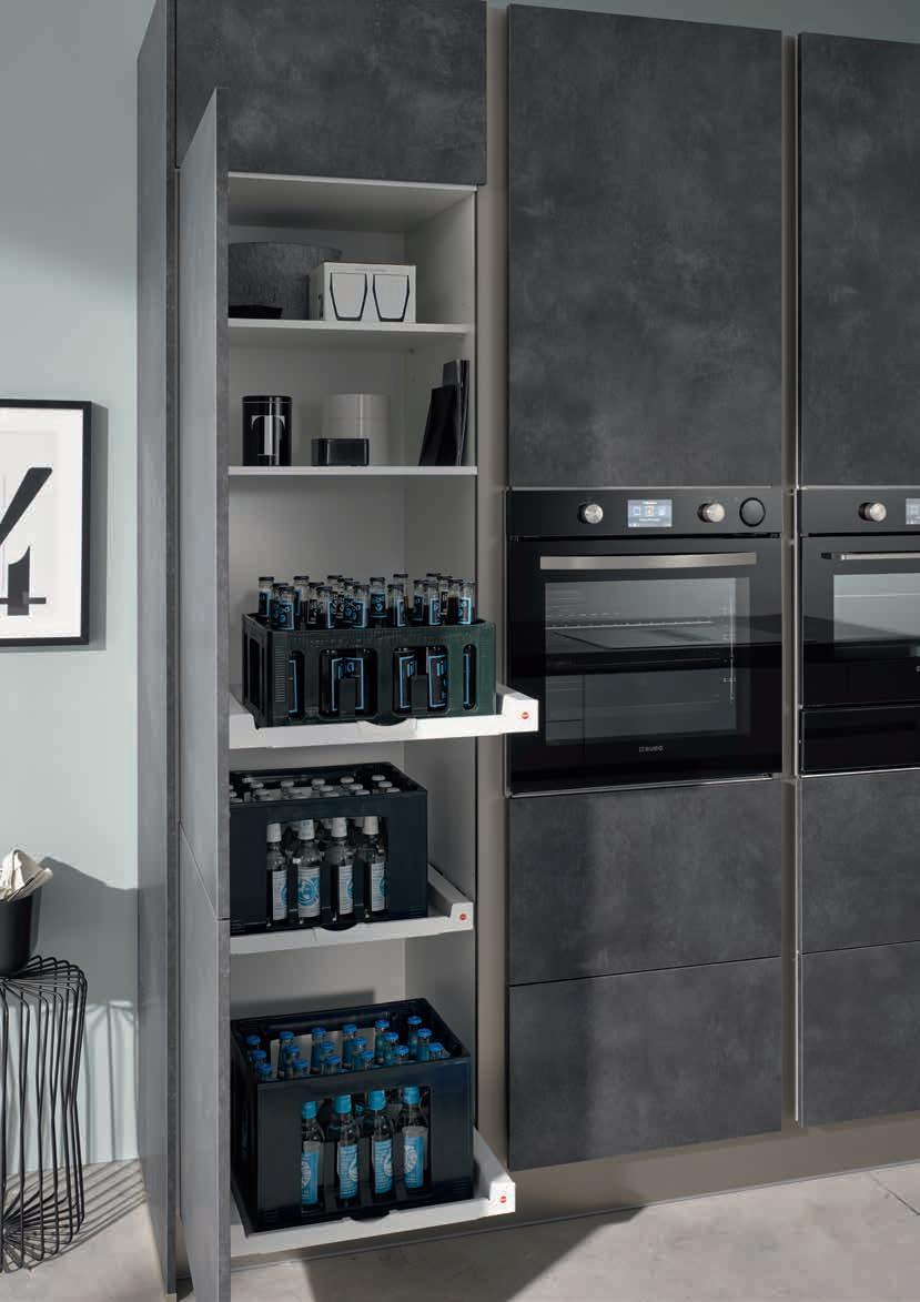 Pour aménager l’arrière-cuisine, nous proposons outre les armoires très spacieuses de nombreuses options et accessoires judicieux dans notre programme. Ils permettent d’utiliser pleinement la place disponible et de l’aménager sur mesure.