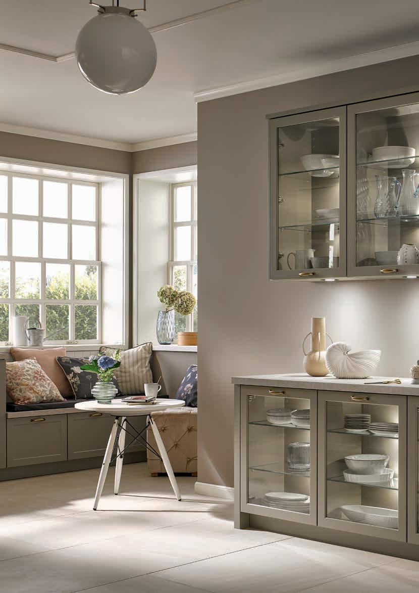 Ton in Ton: Die seidenmatt lackierte Rahmenfront begeistert mit sorgfältiger handwerklicher Verarbeitung im sanften Farbton Greige. Landhausgriffe, Vitrinenschränke und Sichtseiten mit Paneelwirkung unterstreichen den sympathischen Cottage Style.