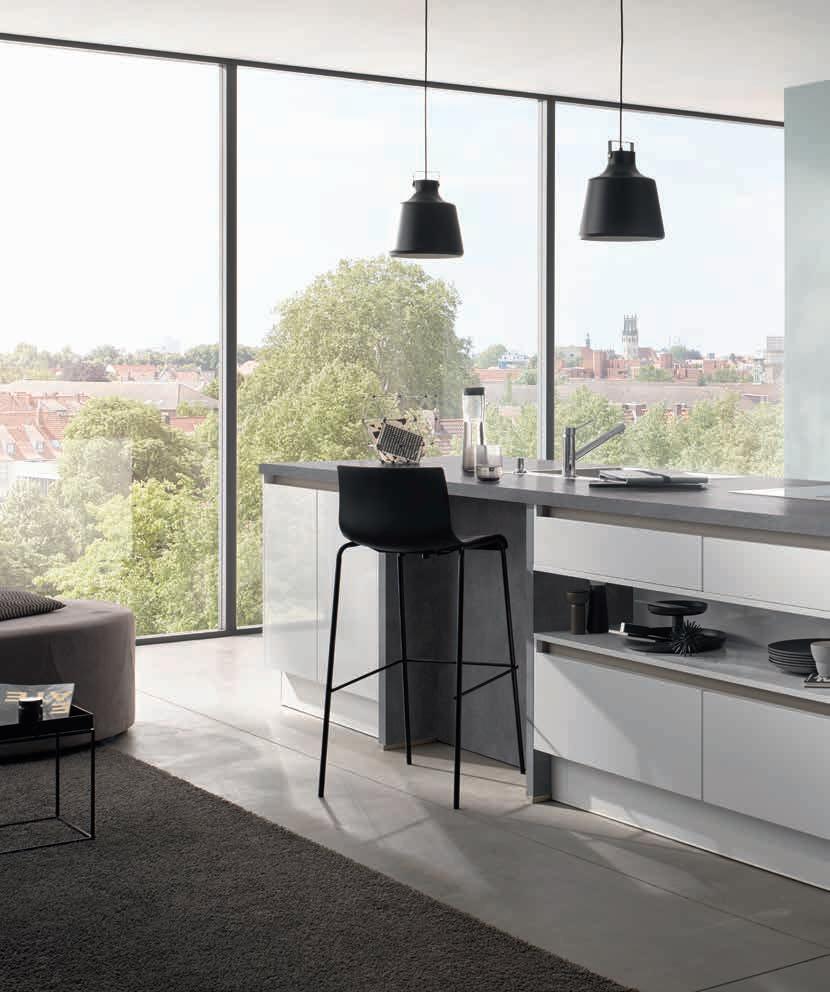 De werkbladen en de achterwand zien eruit alsof ze uit één mal zijn gegoten. De naadloos geïntegreerde functionele zones voor spoelen en koken benadrukken de royale uitstraling.
