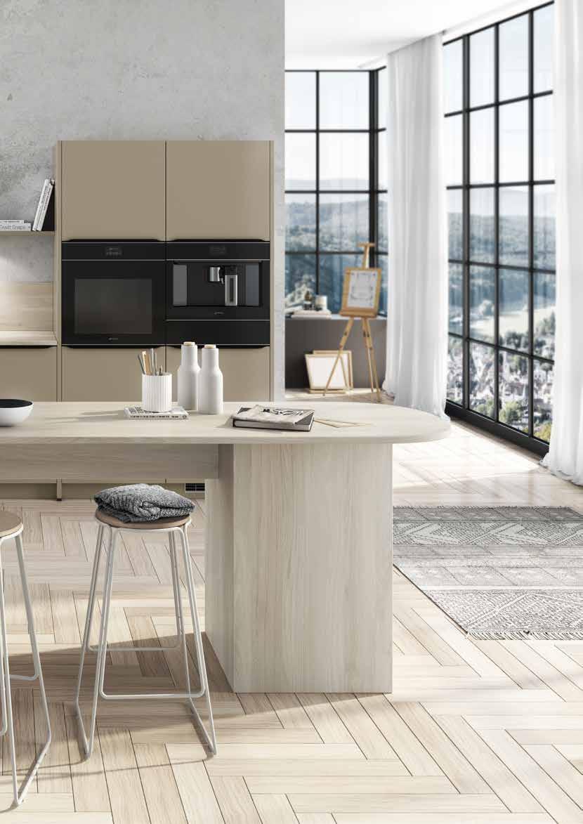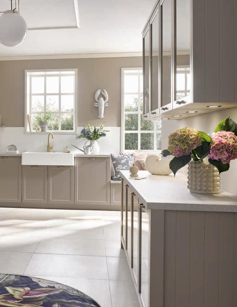 Ton sur ton: het zijdemat gelakte raamwerkfront valt in de smaak met een zorgvuldige handmatige afwerking in de zachte kleur greige. Landhuisgrepen, vitrinekasten en zichtbare zijden met paneeleffect onderstrepen de sympathieke cottage style.