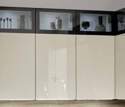 A sideboard in glass display cabinet look makes a unique eyecatcher. The soft greige shade makes brings radiance to this ensemble in combination with glass and light. Glaspoint LED lights say “wow”.