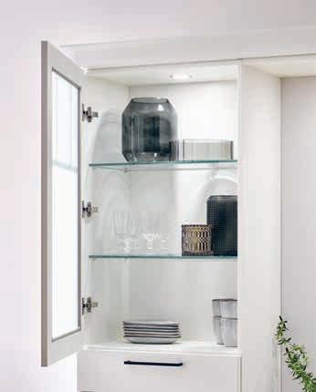 De buffetkast in vitrine-look wordt een unieke blikvanger. De zachte tint Greige laat het geheel schitteren in het samenspel van glas en licht. De Glaspoint led-inbouwlampen zorgen voor echte wow-effecten.