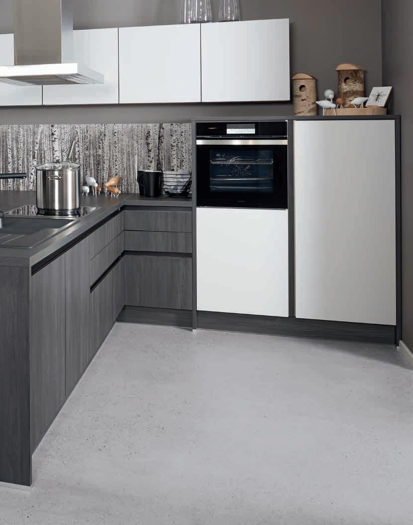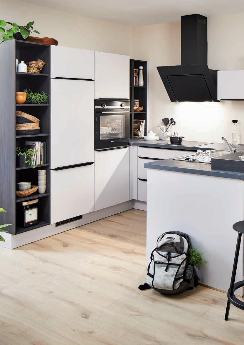 L’électroménager à hauteur ergonomique, comme dans ce meuble très résistant, est toujours une bonne idée. Des espaces de rangement ont même été prévus dans le meuble d’angle ou sous l’évier. Une bonne planification permet ainsi d’exploiter efficacement chaque centimètre carré dans l’arrière-cuisine.