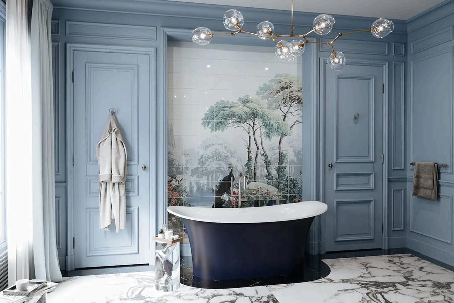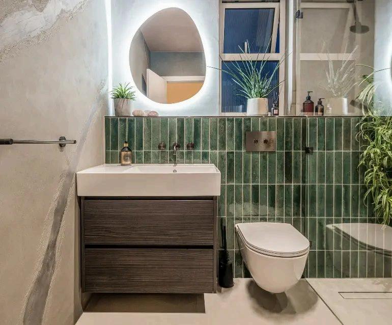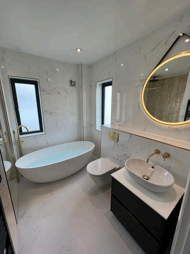 Thiscontemporarybathroomembodiesunderstated luxury with its seamless blend of clean lines and highendfinishes.Whitemarblesurfaceswithsubtle greyveiningcreateacalm,timelessbackdrop,while the freestanding oval bath takes centre stage beneathtallwindowsthatinvitenaturallight.Asleek black vanity with a vessel basin and gold fittings adds a striking contrast, complemented by the illuminatedroundmirrorforamoderntouch.