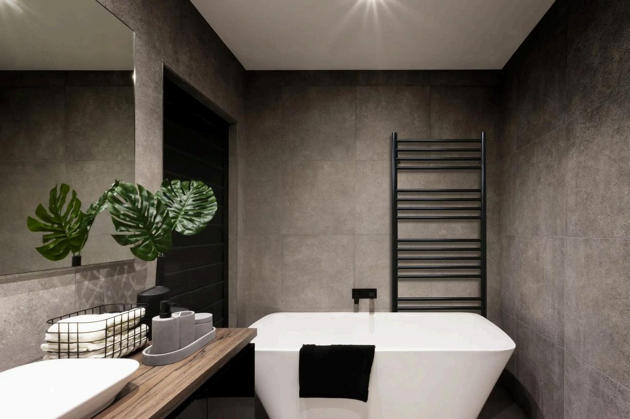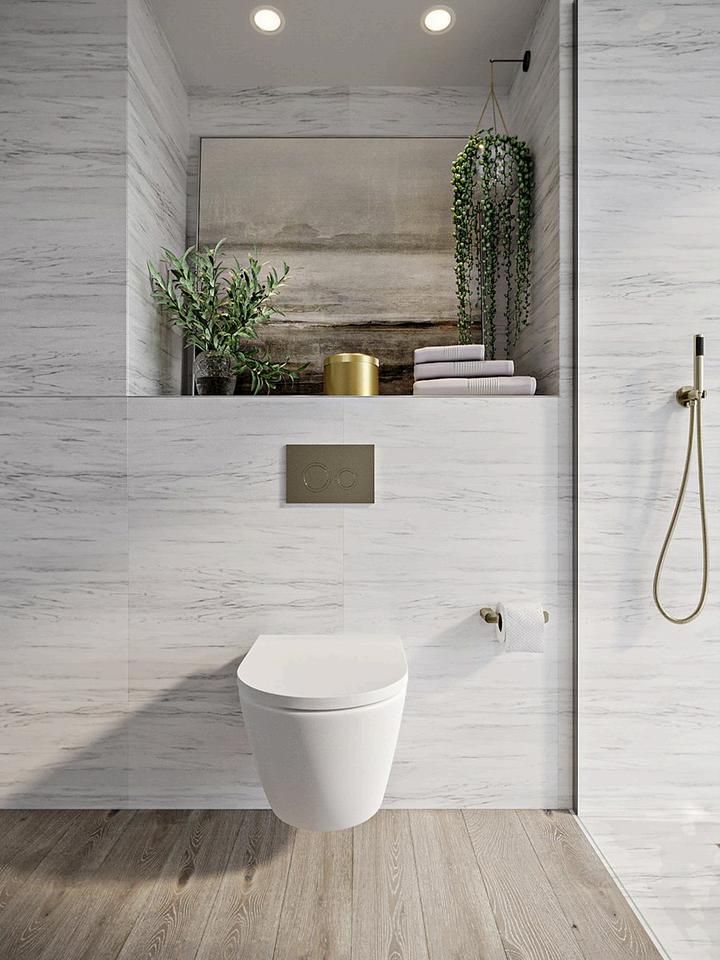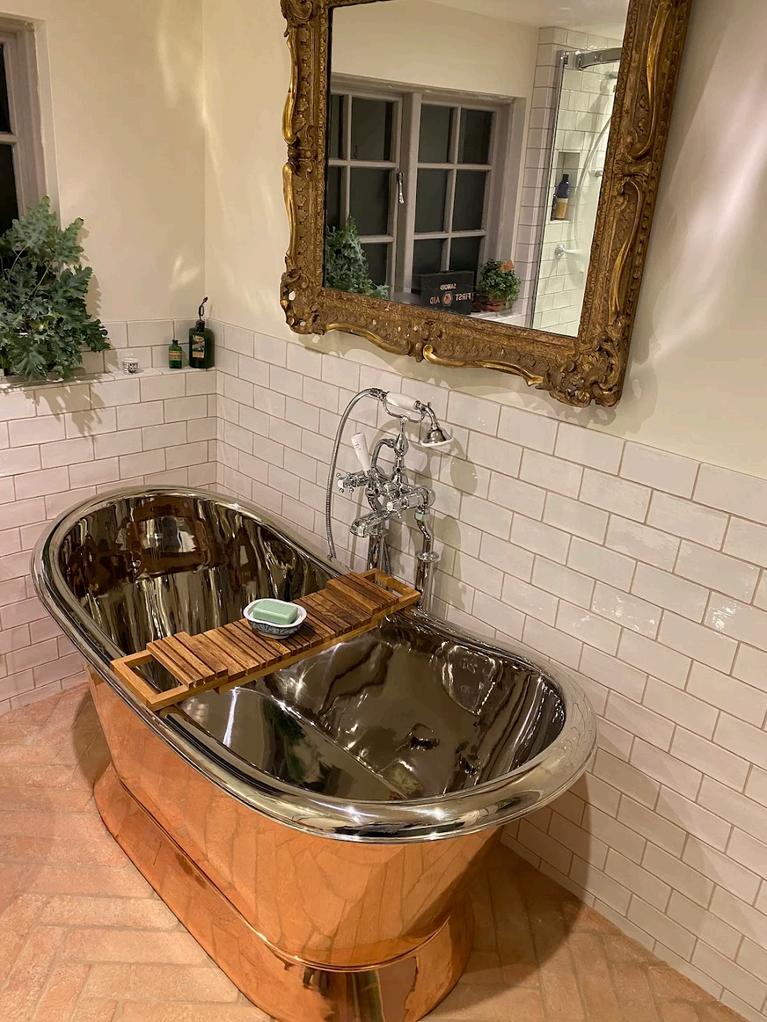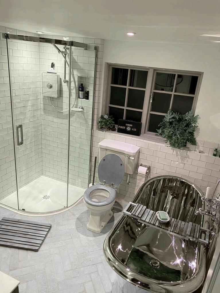 This bathroom combines modern elegance with a touch of natural warmth. The glassenclosed shower with classic white subway tiles creates a crisp, timeless look, while the metallic freestanding bath adds a striking contemporary feature. A wooden bath tray and seat detail on the toilet introduce texture and balance, complemented by herringbone flooring for added visual interest. Thoughtful accents, such as potted greenery on the windowsill and recessed lighting, enhance the fresh, inviting atmosphere. The result is a stylish space that feels both practical and distinctive, blending sleek finishes with homelycharm.